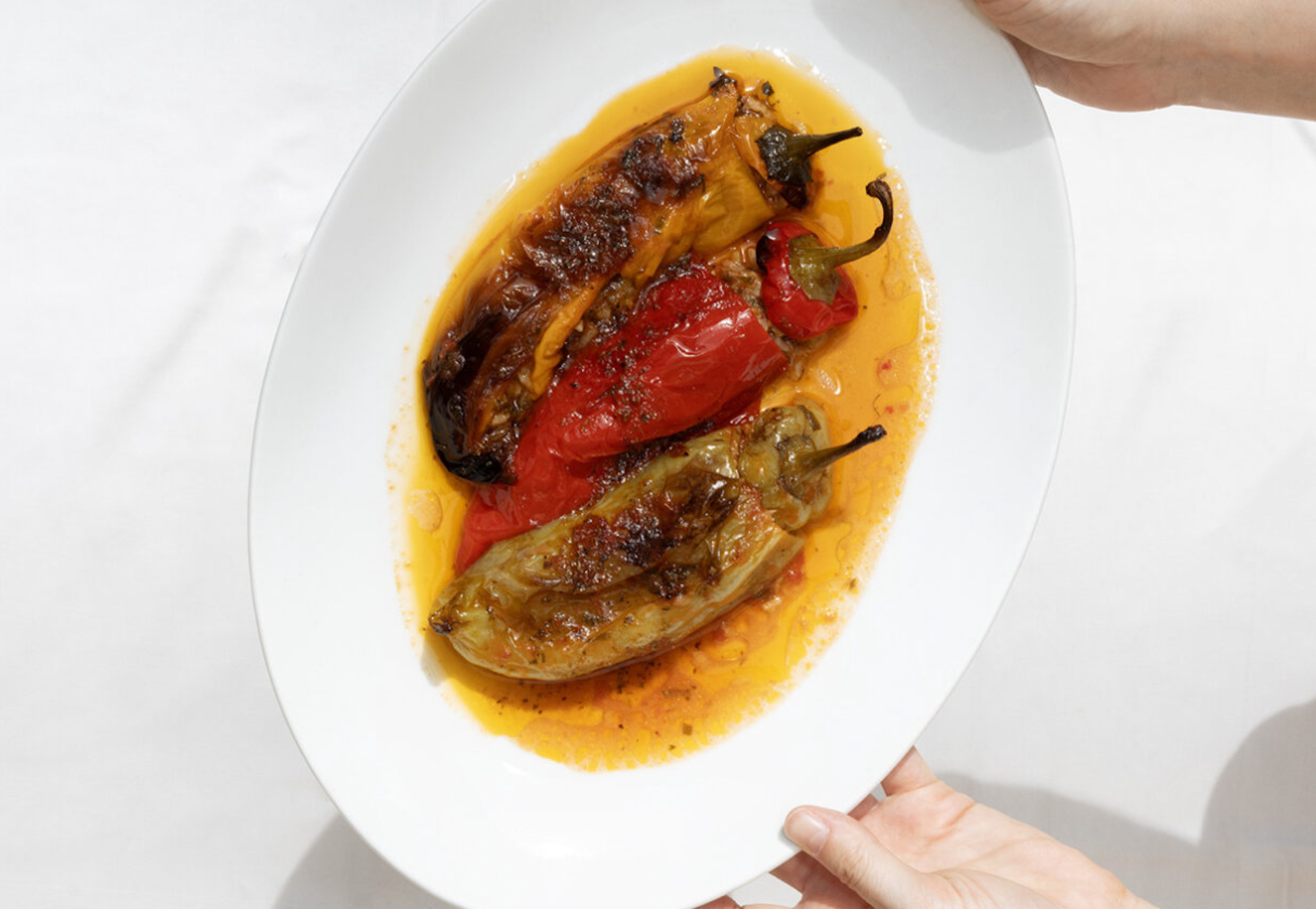 Ο Γιάννης Μούσιος, σεφ στην Ταβέρνα των Φίλων, μας έδωσε τη συνταγή του για γεμιστά με ανάμεικτες πιπεριές κέρατο, σερβιρισμένες με λάδι αρωματισμένο με λιαστή ντομάτα και ρίγανη.