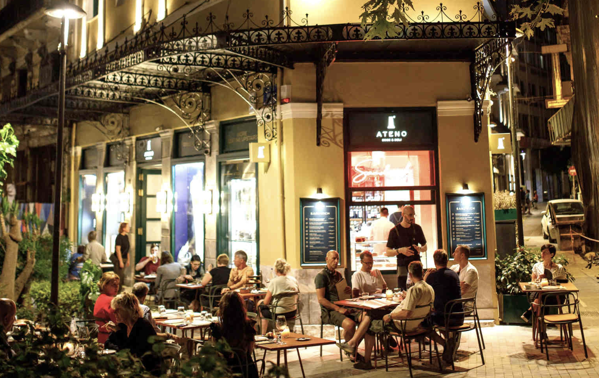 Την πρώτη φορά που βρέθηκα στο Αteno, λίγο αφότου άνοιξε, κάθισα σ’ ένα τραπέζι επάνω, στη σάλα με τα χωρίσματα-βιτρό και τους μοντέρνους πίνακες στους τοίχους. Από το παράθυρο την χάζευα την Αιόλου, ήσυχη ήταν τότε. Τώρα είναι αλλιώς. Καλοκαιρινή. Πιο φασαριόζα. Κάθεσαι κάτω από το διώροφο νεοκλασικό, ανάμεσα στα παρτέρια του πεζόδρομου και στα κρεμασμένα αλλαντικά και τα τυριά που φιγουράρουν πίσω από το τζάμι – βιτρίνα. Δίνουν τον τόνο. Στο εστιατόριο που έστησαν σε έναν από τους πιο γνωστούς εμπορικούς δρόμους του κέντρου ο Σπύρος και ο Βαγγέλης Λιάκος μαζί με τον σεφ Νίκο Καραθάνο χώρεσαν διάφορες αγάπες: προϊόντα από πολλά μέρη της Ελλάδας –ελαιόλαδα και βιολογικές ελιές, μέλια, ζυμαρικά, βότανα, κρασιά, διαλεγμένα ένα ένα– μοιρασμένα σε ράφια και στα ψυγεία σε ένα μικρό παντοπωλείο… αλά σεφ και μια κουζίνα ελληνική, με σύγχρονο ύφος. Που έχει τα πιο δημιουργικά «εφέ» της, αλλά αυτό που σε κερδίζει τελικά είναι η νοστιμιά της.