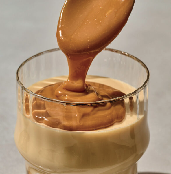 - Προσθέτουμε το γάλα με τις ζελατίνες και 80 γρ. από την καραμέλα που φτιάξαμε (να έχει κρυώσει καλά) και ανακατεύουμε πολύ καλά.