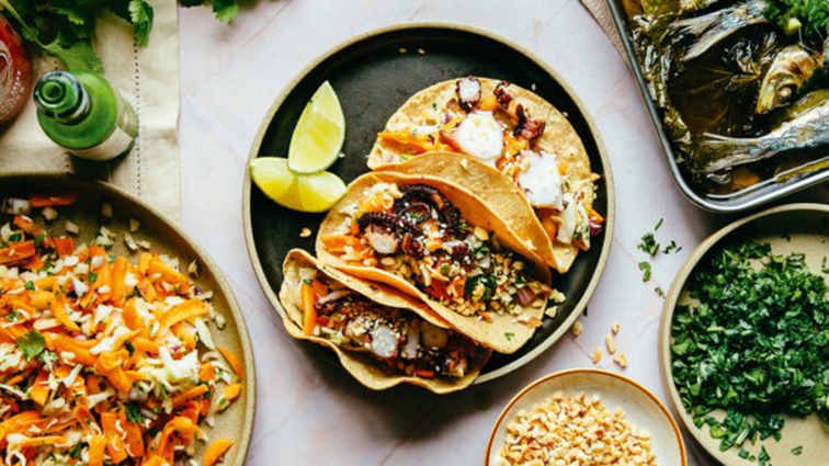 - Για να φτιάξουμε tacos με χταπόδι και σαλάτα, αρχικά προθερμαίνουμε τον φούρνο στους 220°C.