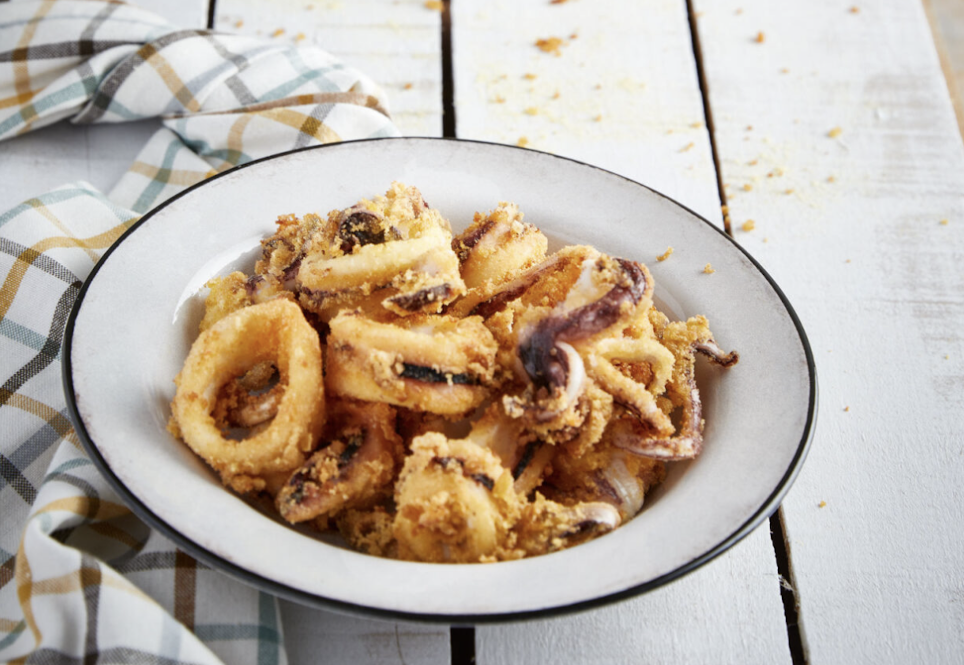 Λαχταριστά και μυρωδάτα καλαμαράκια τηγανητά, με τραγανή κρούστα από μπαχαράτο σιμιγδάλι. Απίθανος μεζές!