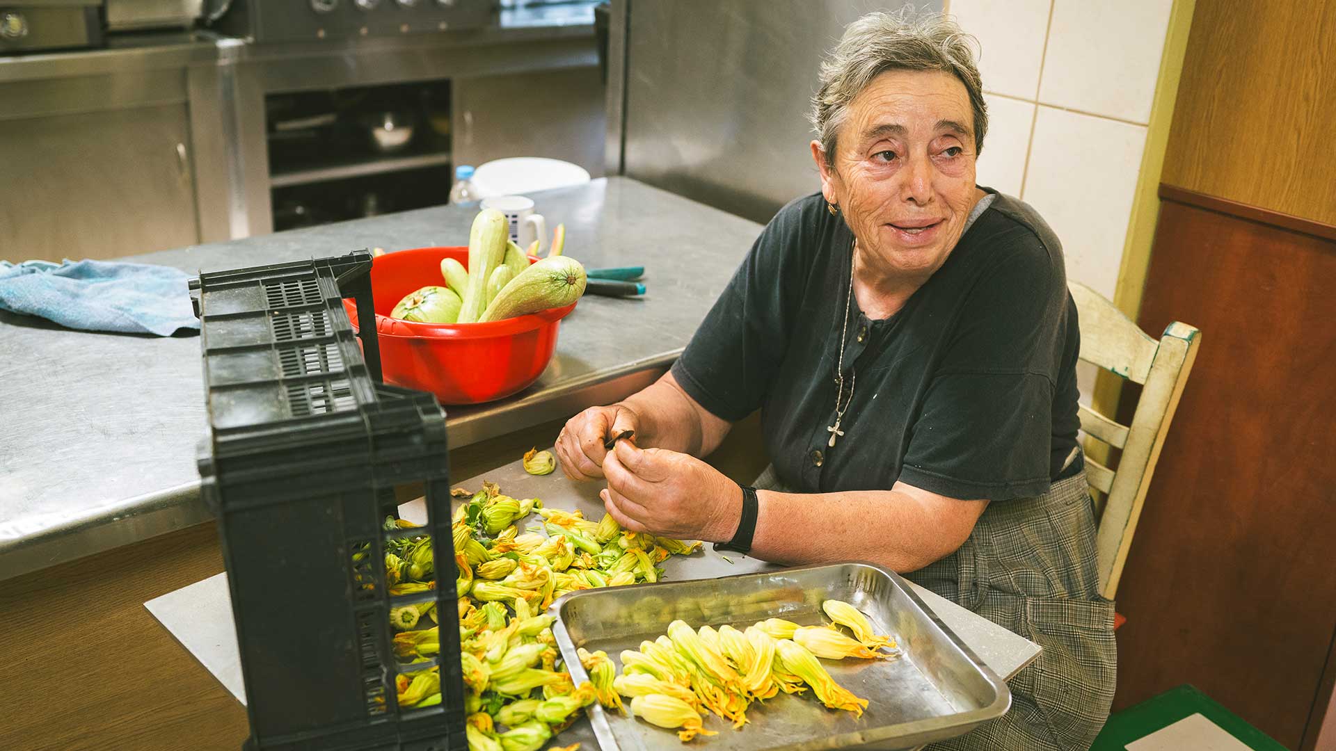 Η αυλή τους είναι χαρά Θεού, όλο δροσιά και χαδιάρικα γατιά. Οι περισσότεροι πελάτες ξημεροβραδιάζονται εκεί. Όσοι ξέρουν μπαίνουν στο μαγαζί για να διαλέξουν από τη βιτρίνα τα μαγειρευτά ημέρας. Είχαν κόψει από τον κήπο άσπρες μελιτζάνες την προηγούμενη μέρα και τις έκαναν χαρακωτές με σκόρδο και λίγη κανέλα, κι είχαν ένα μέλωμα πληθωρικό. Πήραμε φάβα στολισμένη με γούστο και φρεσκάδα με ολίγα καπαρόφυλλα, κρεμμυδάκια λεπτοκομμένα, ντοματίνια, πιπερίτσες, ελιές κι αγγουράκια, ένα ωραίο απαλό τζατζίκι λουσμένο με καλό λάδι και καπαρόφυλλα, χωριάτικη με ντομάτες ζουμερές, την τελευταία μερίδα παστίτσιο που είχε μείνει, αγκινάρες με φρέσκα κουκιά και μια λεμονάτη χοιρινή μπριζόλα με πατάτες στον φούρνο που κοντέψαμε να φάμε και το πιάτο. Άλλες μέρες έχει άλλα φαγιά: μακαρόνια με κιμά, κεφτέδες, κόκορα φρικασέ, κόκορα κρασάτο… «Σήμερα θα κόψουμε ανθούς, το βράδυ θα τους γεμίσουμε, κι αύριο θα τους κάνουμε τηγανητούς» ενημερώνουν τους τακτικούς πελάτες.