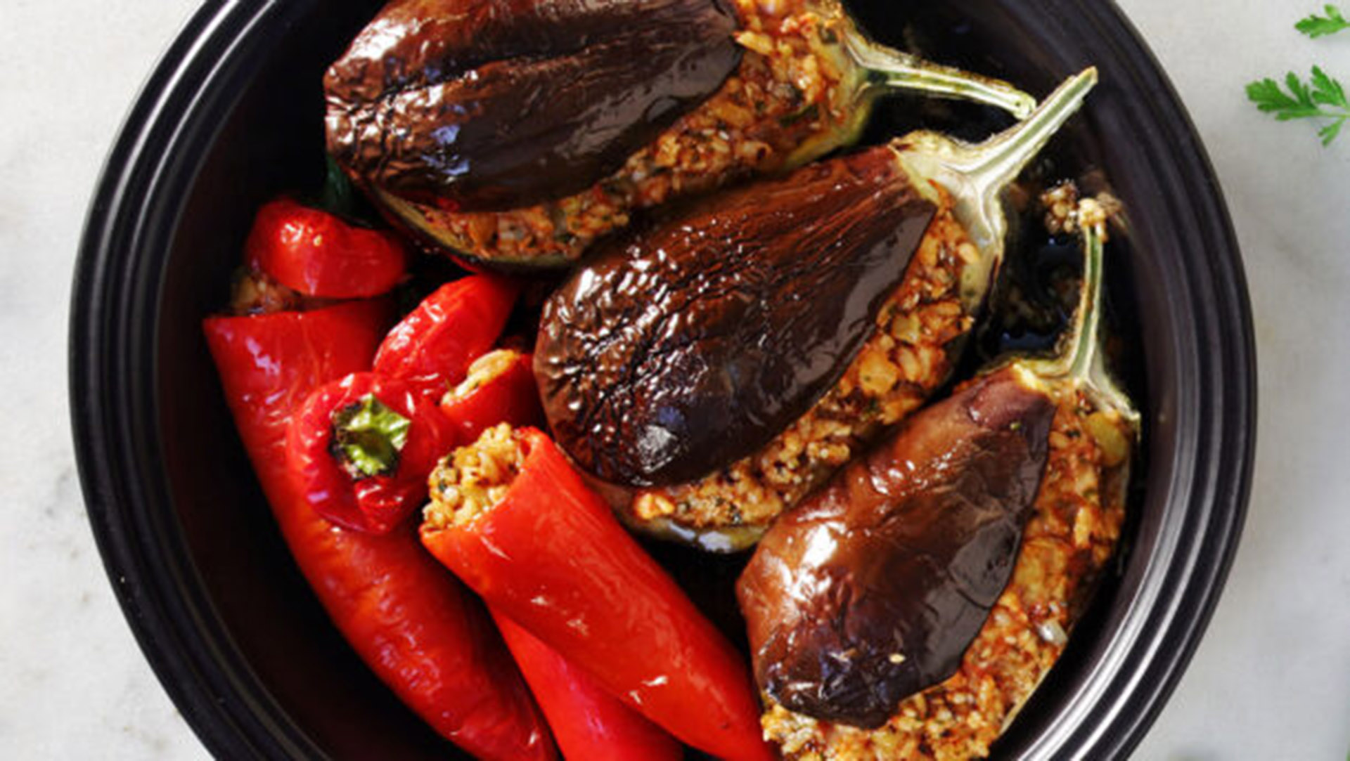 - Ανακατεύουμε, γεμίζουμε τα λαχανικά μας αφήνοντας 1 εκ. από την κορυφή και βάζουμε σε ταψί που να τα χωράει ακριβώς, το ένα γεμιστό δίπλα στο άλλο.