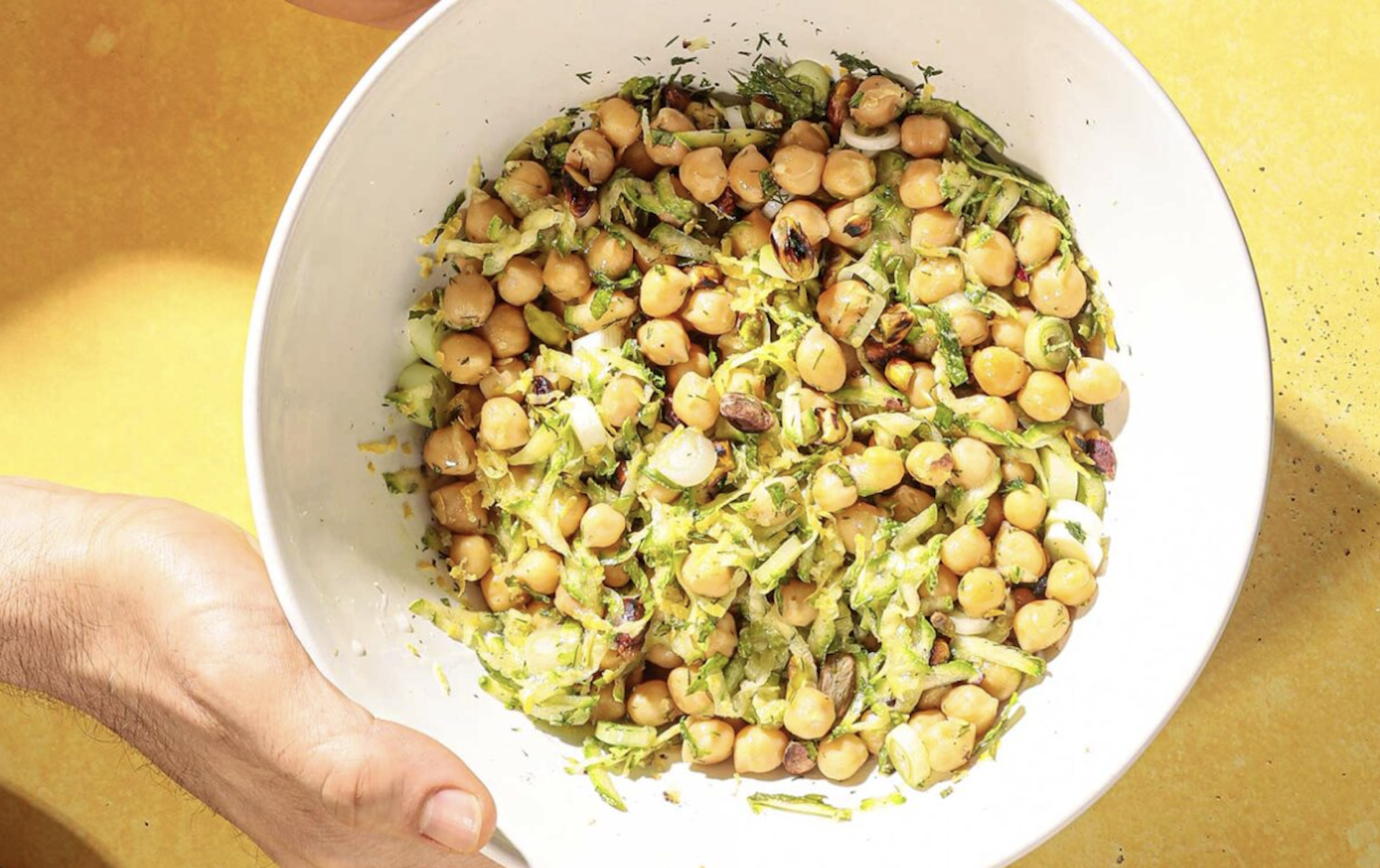 Μία από τις καλύτερες φυτικές πηγές πρωτεΐνης υψηλής βιολογικής αξίας, τα ρεβύθια περιέχουν όλα τα απαραίτητα αμινοξέα στην επιθυμητή αναλογία και ιδιαίτερα το αμινοξύ μεθειονίνη, που τα κατατάσσει στις πλήρεις πρωτεΐνες, όπως το κρέας και το γάλα. Ο συνδυασμός με τα κολοκυθάκια και τους ξηρούς καρπούς αυξάνει την περιεκτικότητα του γεύματος σε βιταμίνες, αντιοξειδωτικά και πολυακόρεστα λιπαρά οξέα. Η σαλάτα έχει 430 Kcal/μερίδα.