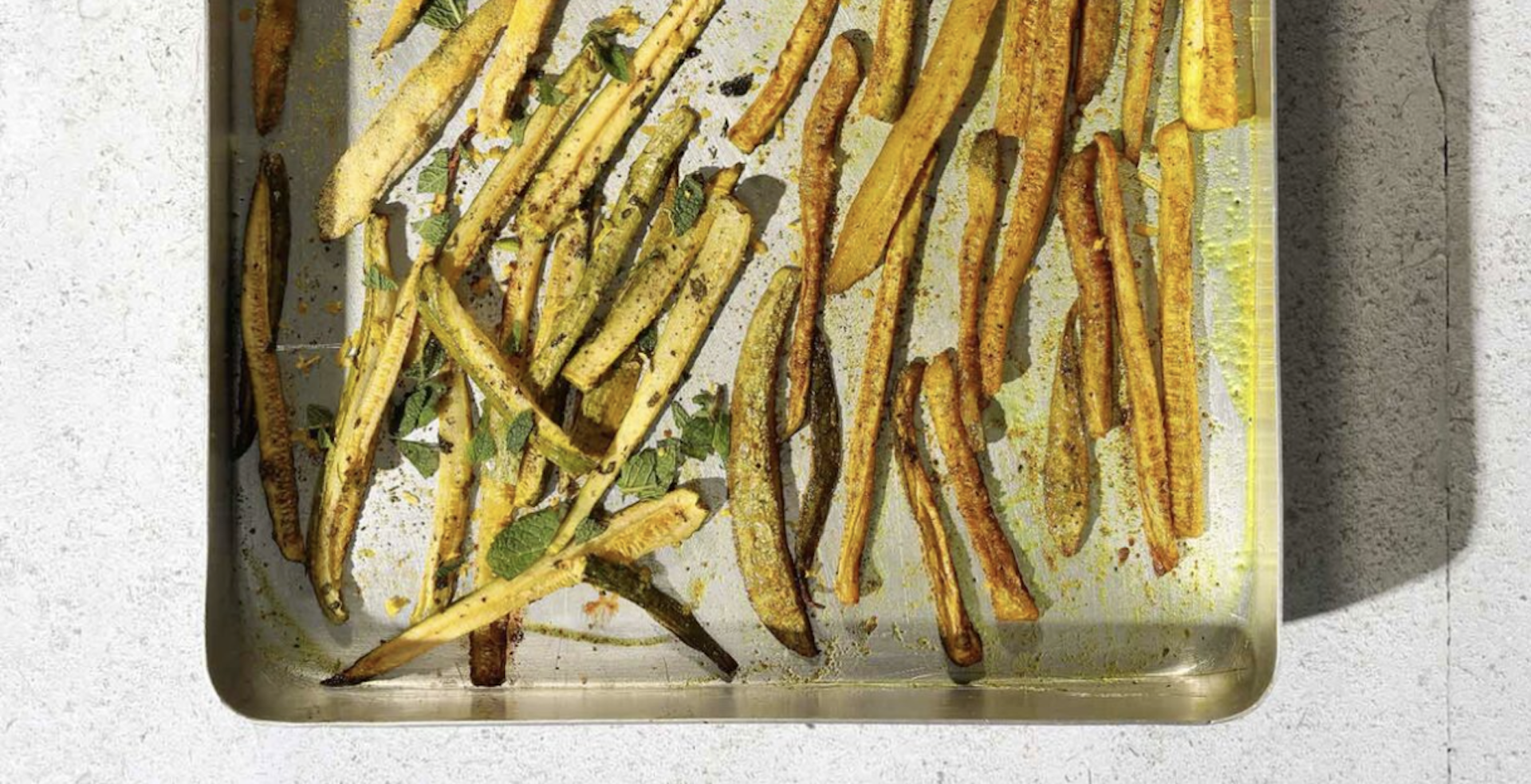 - Μαζί με το ελαιόλαδο προσθέτουμε 1 1⁄2 κουτ. γλυκού σκόνη κάρι και τρίβουμε απαλά τα μπαστουνάκια για να καλυφθούν.
