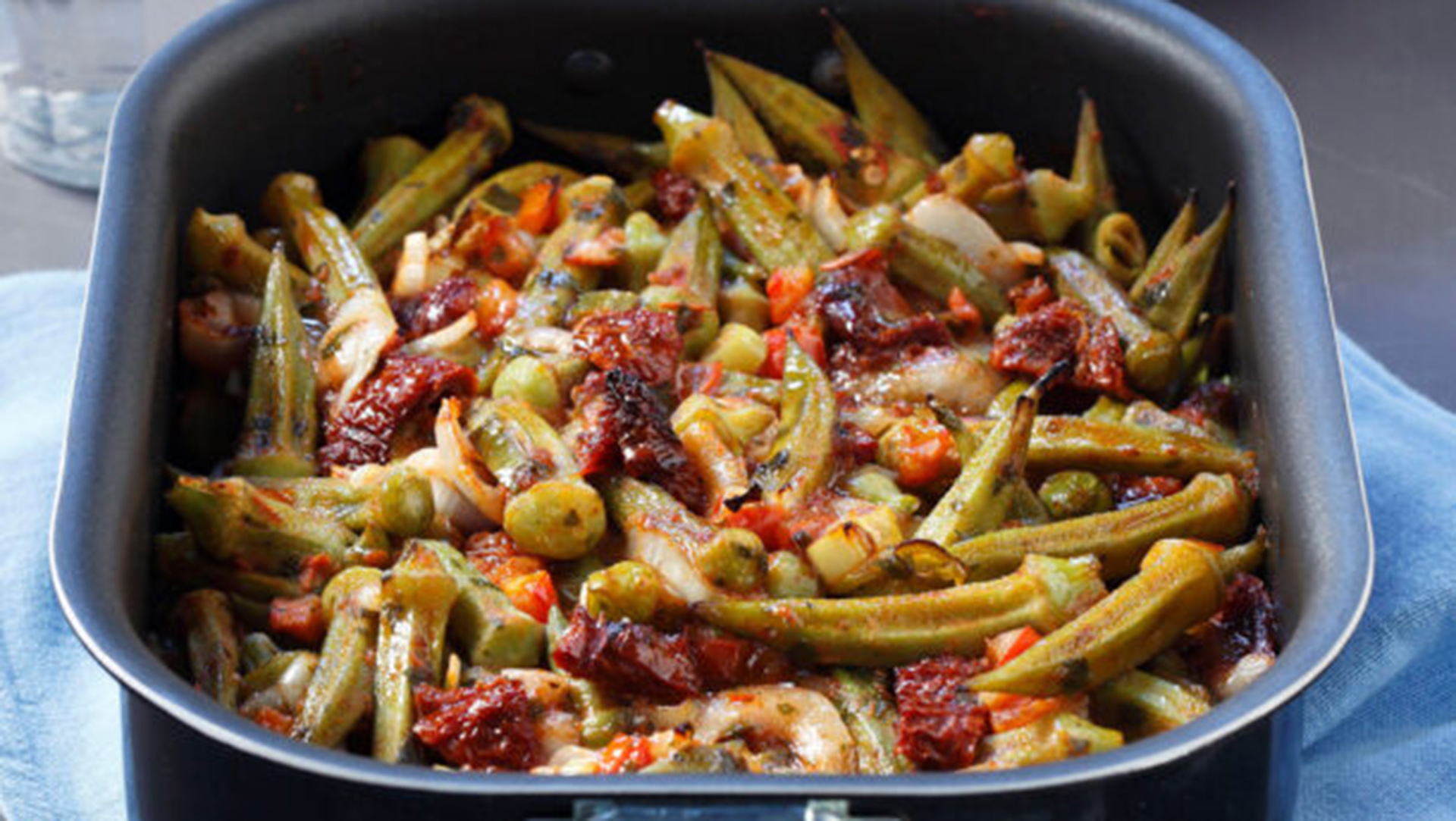 - Αδειάζουμε τη σάλτσα στο ταψί με τις μπάμιες, ανακατεύουμε και σκεπάζουμε με αλουμινόχαρτο ή λαδόκολλα. Ψήνουμε τις μπάμιες για 30 λεπτά.