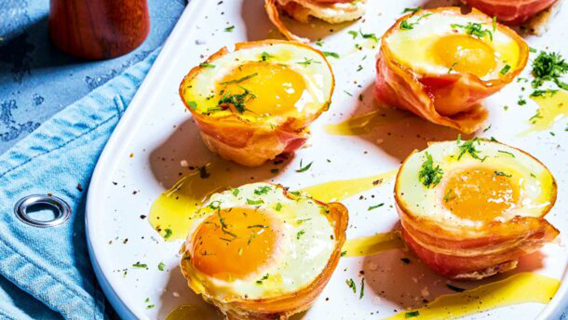 - Φουρνίζουμε και ψήνουμε για 30 λεπτά, μέχρι να σφίξουν τα ασπράδια και να ροδίσουν απαλά οι άκρες του μπέικον.