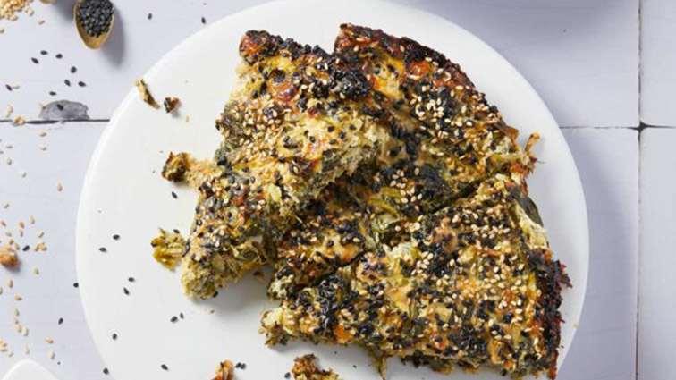 - Στρώνουμε το μείγμα με τα χέρια μας ομοιόμορφα και πασπαλίζουμε με το σουσάμι και το μαυροκούκι.
