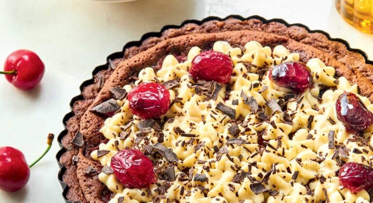 - Στραγγίζουμε τα κεράσια (κρατάμε το σιρόπι στην άκρη) και καλύπτουμε με αυτά όλη την επιφάνεια της τάρτας. Κρατάμε κάποια στην άκρη για το στόλισμα.