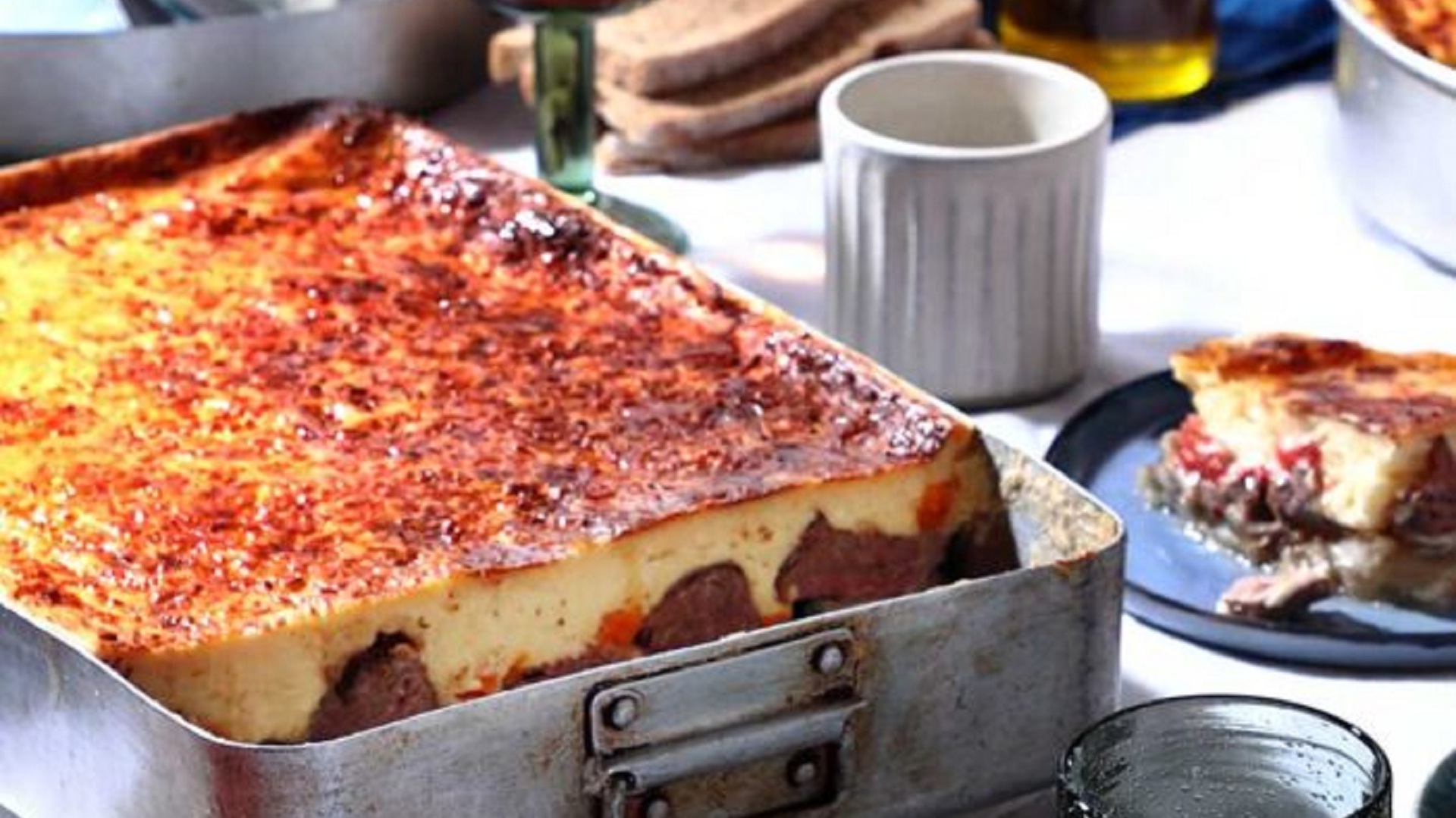 Eχει μελιτζάνες και πατάτες και πλούσια μπεσαμέλ, αντί για κιμά όμως έχει μοσχαράκι κρασάτο αυτός ο μουσακάς. Και είναι πραγματικά πεντανόστιμος.
