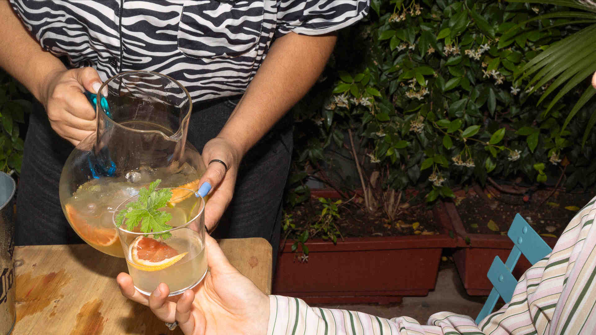 Ένα κοκτέιλ δροσερό, γλυκόξινο, αρωματικό και με οικείες γεύσεις μάς έφτιαξε η Μυρσίνη Σπανέλη σε ένα μπαλκόνι στην Κυψέλη. Με δύο λικέρ, μαστίχας και πορτοκαλιού, μέλι, φρεσκοστυμμένο λεμόνι και αρμπαρόριζα από τη γλάστρα.