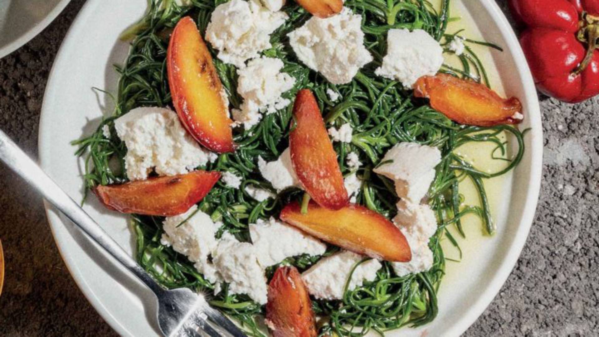 - Για τη σαλάτα αλμύρας με μανούρι, ροδάκινο και ψητό σκόρδο, ξεκινάμε με τα ροδάκινα.