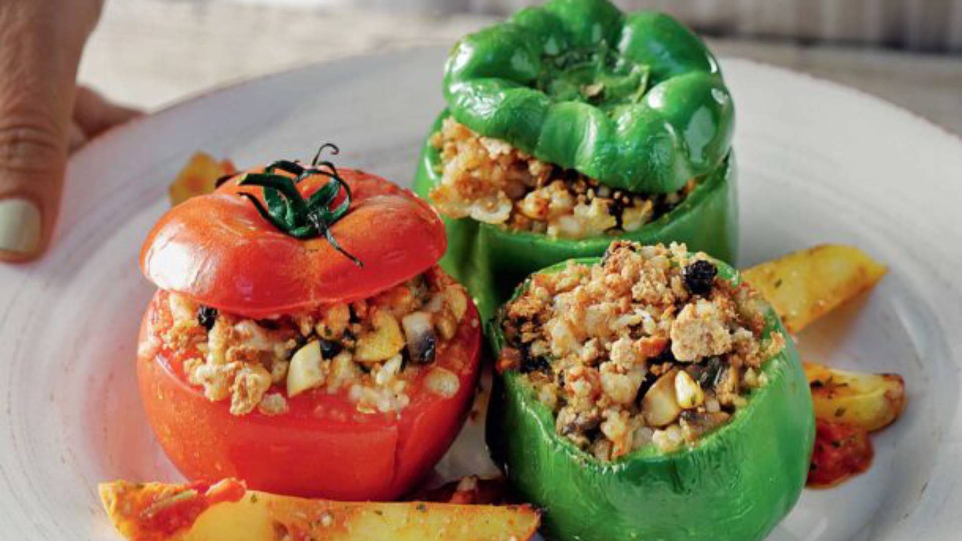 - Κόβουμε από τις ντομάτες ένα καπάκι στην πλευρά με το κοτσάνι και με ένα μικρό κουτάλι αδειάζουμε τη σάρκα με το ζουμί τους σε ένα μπολ, αφήνοντας ένα κέλυφος με πάχος περίπου 1 εκ. Επαναλαμβάνουμε τη διαδικασία με τις πιπεριές, αφαιρώντας τα σπόρια.