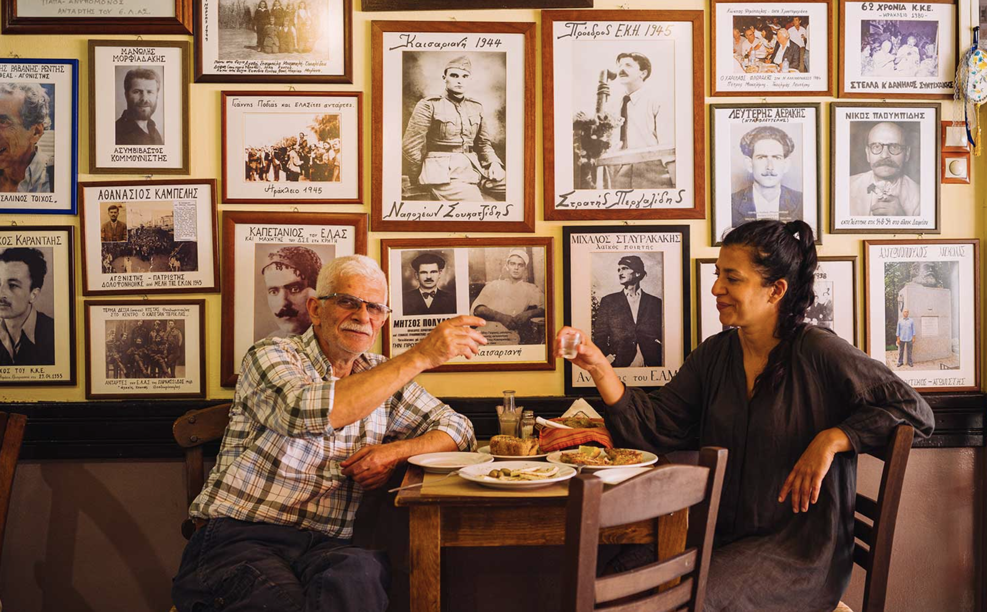 Ο ίδιος δεν πίνει, γιατί λέει «έχεις μεγάλη ευθύνη όταν σερβίρεις τον κόσμο και πρέπει να είσαι νηφάλιος», όμως μας κερνάει μια δεύτερη γύρα ρακές και η Χαρά από την κουζίνα μας στέλνει πατάτες οφτές και ανθότυρο στη σχάρα. Όλοι οι καλλιτέχνες της πόλης αλλά και όσοι είναι επισκέπτες στο Ηράκλειο θα περάσουν από εδώ. Ο Καγιαμπής θυμάται από Καζάκο μέχρι Παπακωνσταντίνου και Τσακνή, κι από τον μουσικό Λάκη Χαλκιά μέχρι την Παπαρήγα και τον Αλαβάνο. «Όσοι έρχονται εδώ τραγουδάνε. Έχουν γίνει μνημειώδεις παρέες στον καφενέ». Χαζεύουμε απέναντί μας τη φωτογραφία του δεκαοκτάχρονου Τσε μέσα από το σπίτι του, παραδίπλα ανάμεσα σε άλλες και μια αφίσα από παράσταση του Ριγκολέττο του Βέρντι και μία ακόμη από τους Αθλίους στο μιούζικαλ του Μπρόντγουεϊ, και στο μεταξύ επανέρχεται και αφοσιωνόμαστε ξανά στις κουβέντες μας, στις επόμενες ρακές, στο ξιδάτο λουκάνικο και στο παχύ ανθόγαλο. «Στην υγειά μας, να συνεργαζόμαστε, να στοχαζόμαστε, να αγωνιζόμαστε και να αγαπιόμαστε», είπε και ξεχείλισε τα ποτήρια μας με ρακές ξανά.