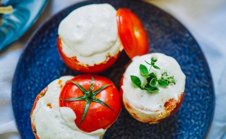 - Σκεπάζουμε τις γεμισμένες ντομάτες με τα καπάκια τους και σερβίρουμε ή τις αφήνουμε για περίπου 1 ώρα στο ψυγείο για να σφίξει κι άλλο η κρέμα.