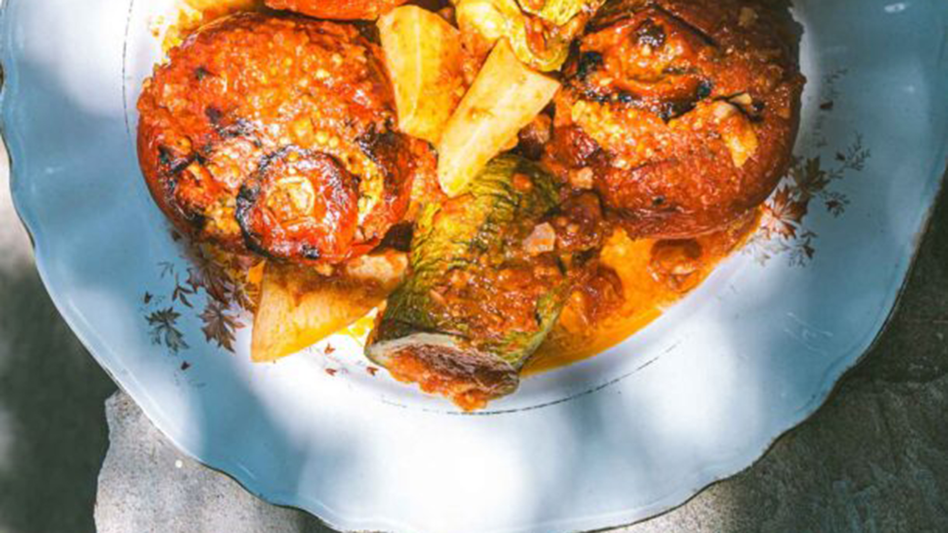 «Πού και πού ενδιάμεσα από τις ντομάτες βάζω και καμιά πατάτα καρφωτή», λέει η Ερμουπολίτισσα κυρία Μαρίκα Πρέκα, που μας έδωσε τη συνταγή, καθώς ετοιμάζει το ταψί με τα γεμιστά. Ποτέ δεν ψήνει ένα φαγητό στον φούρνο μόνο του, πάντα θα βάλει δύο τουλάχιστον.