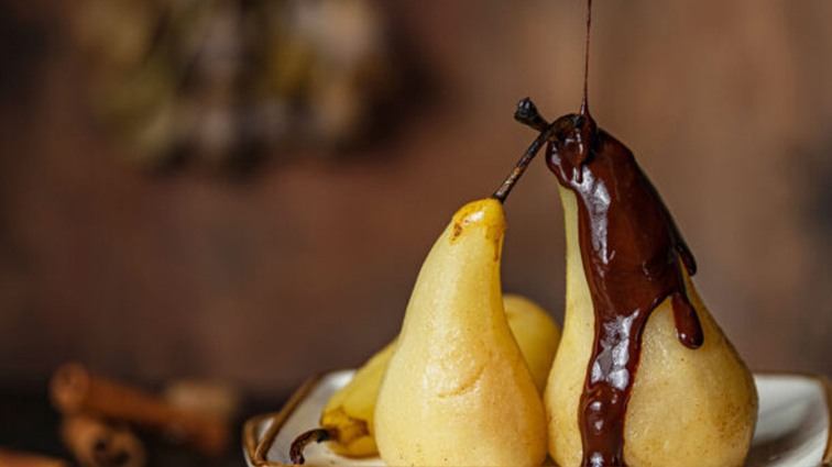 - Βγάζουμε τα αχλάδια με τρυπητή κουτάλα και τα σερβίρουμε σε πιάτα ή μπολ. Τα περιχύνουμε με τη σάλτσα σοκολάτας και συνοδεύουμε με 1-2 μπάλες παγωτό στην κάθε μερίδα. Αν θέλουμε, σκορπάμε και λίγο αμύγδαλο φιλέ ή φουντούκι πάνω από τη σος.