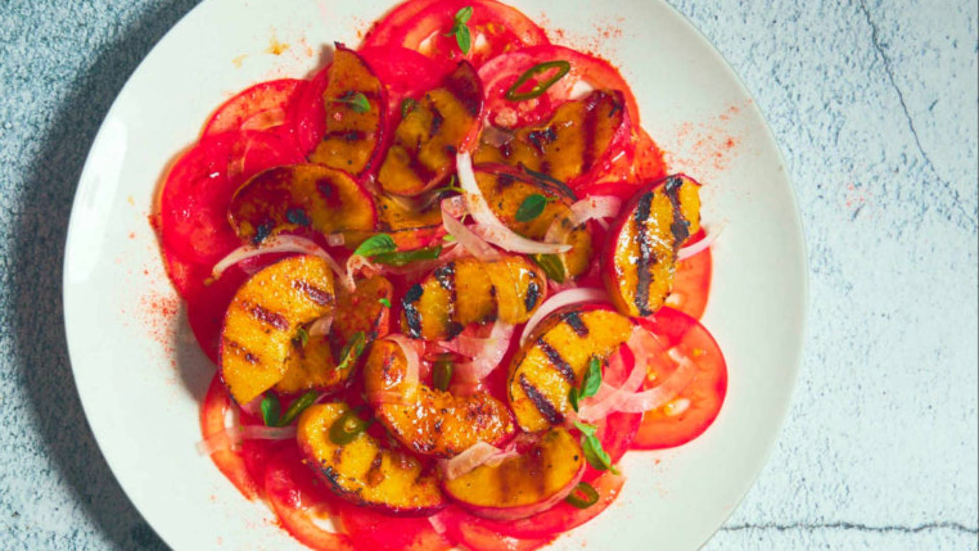 Μια διαφορετική ντοματοσαλάτα, γλυκοκαυτερή και μια ιδέα εξωτική, με τις ολόγλυκες ζουμερές φέτες από ροδάκινο να κυριαρχούν.