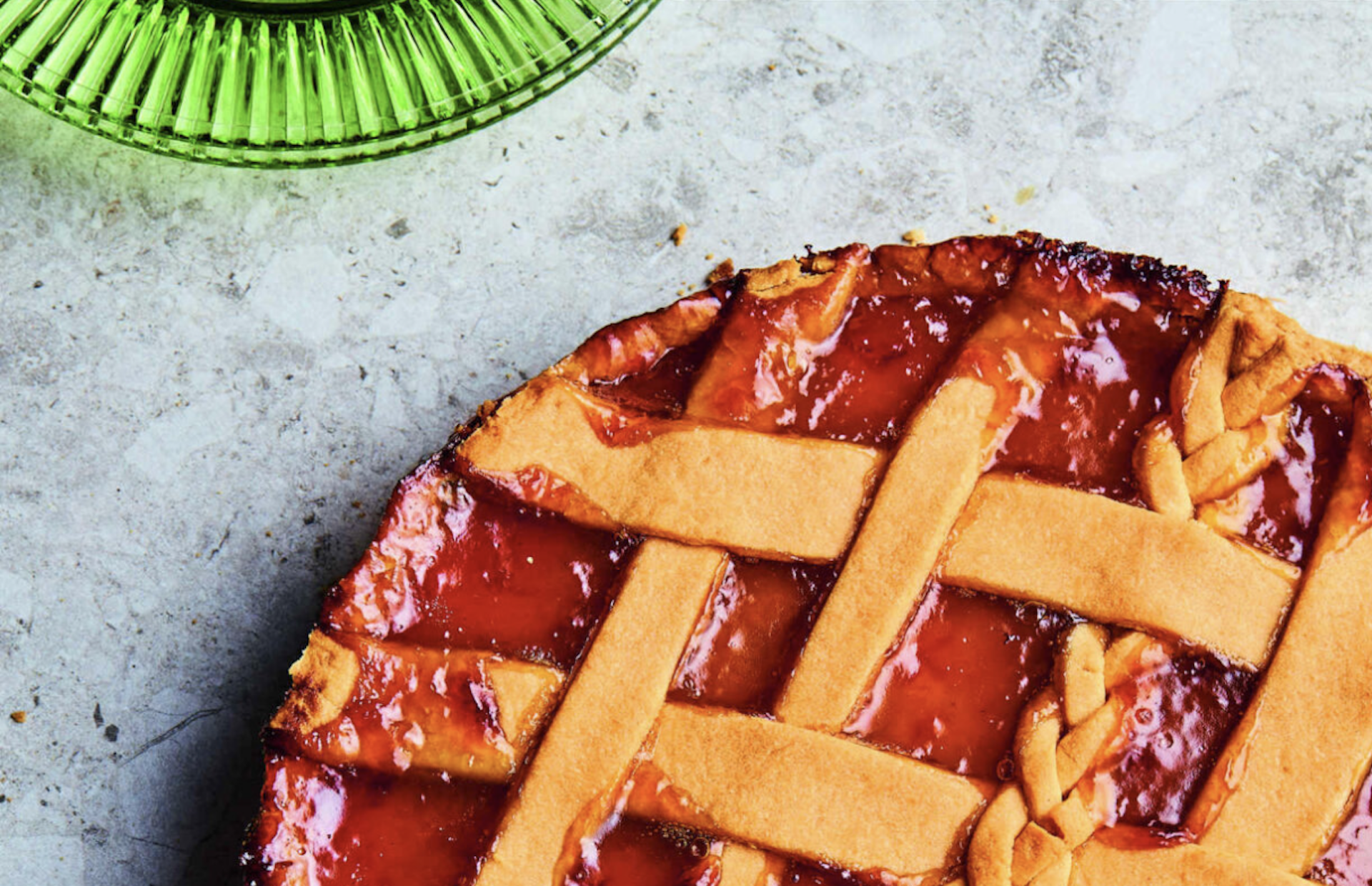 - Κόβουμε 6-7 λωρίδες με 1,5 εκ. φάρδος εκάστη, τις οποίες τοποθετούμε παράλληλα πάνω από τη μαρμελάδα σε ίσες αποστάσεις, προσαρμόζοντας το μήκος τους στο ταψί.