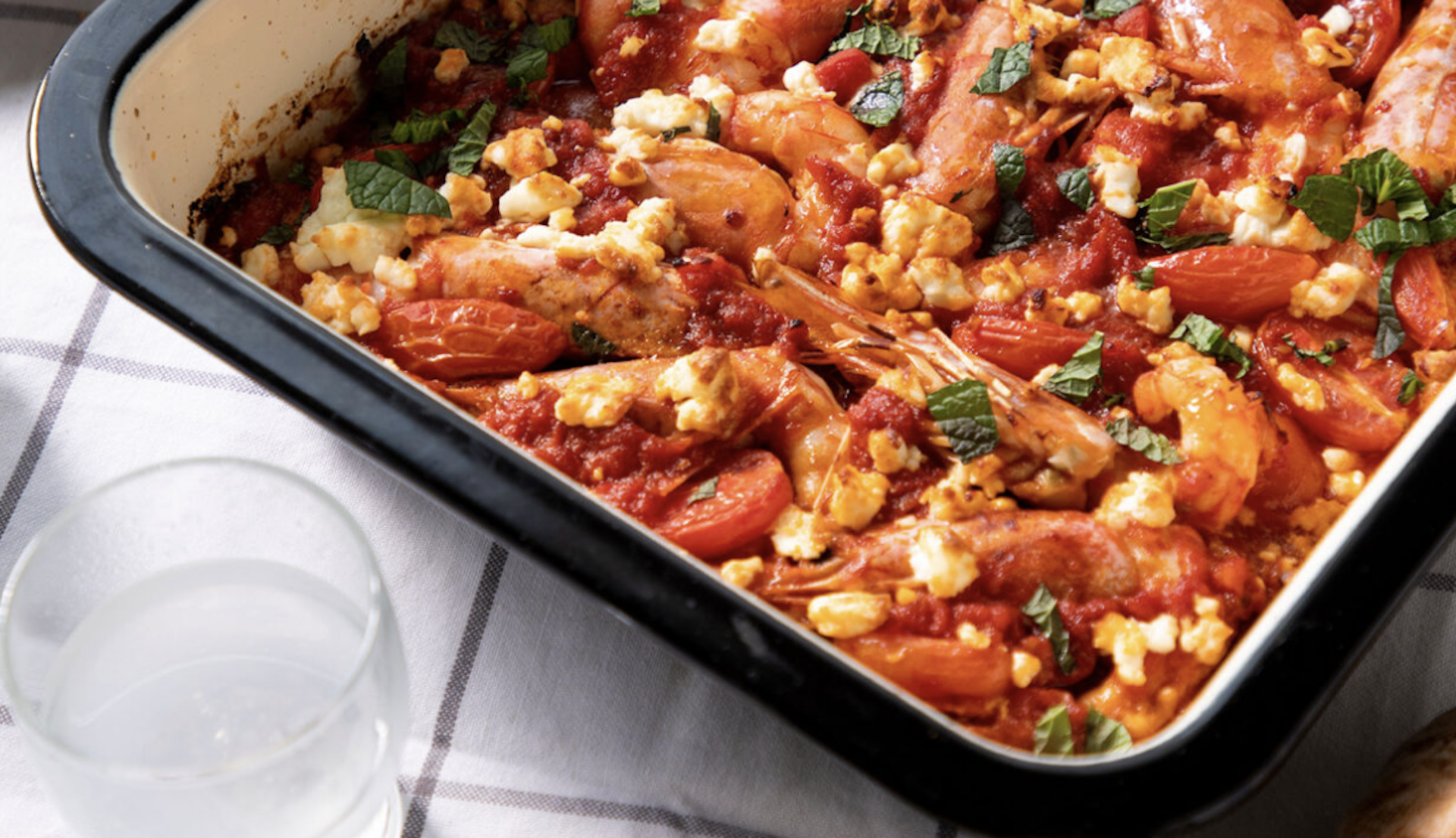 Λαχταριστές γαρίδες σαν σαγανάκι, με φέτα, μυρωδικά και ντοματίνια. Αρωματισμένες με ούζο και σε γενναίες ποσότητες, μέσα στο ταψί του φούρνου.
