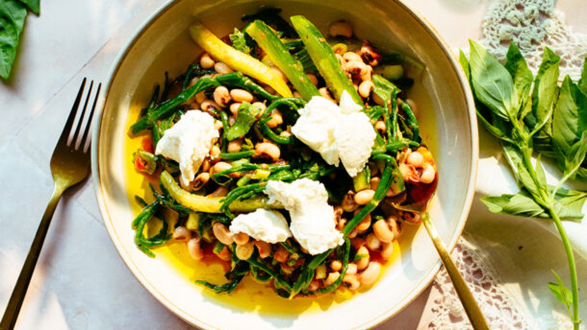 Πλούσια και χορταστική οσπριοσαλάτα, μα συνάμα ελαφριά, εύκολη και μυρωδάτη. Ιδανική για τις ζεστές ημέρες. Βασικό υλικό της, εκτός από τα μαυρομάτικα, η καλοκαιρινή, τρυφερή αλμύρα.