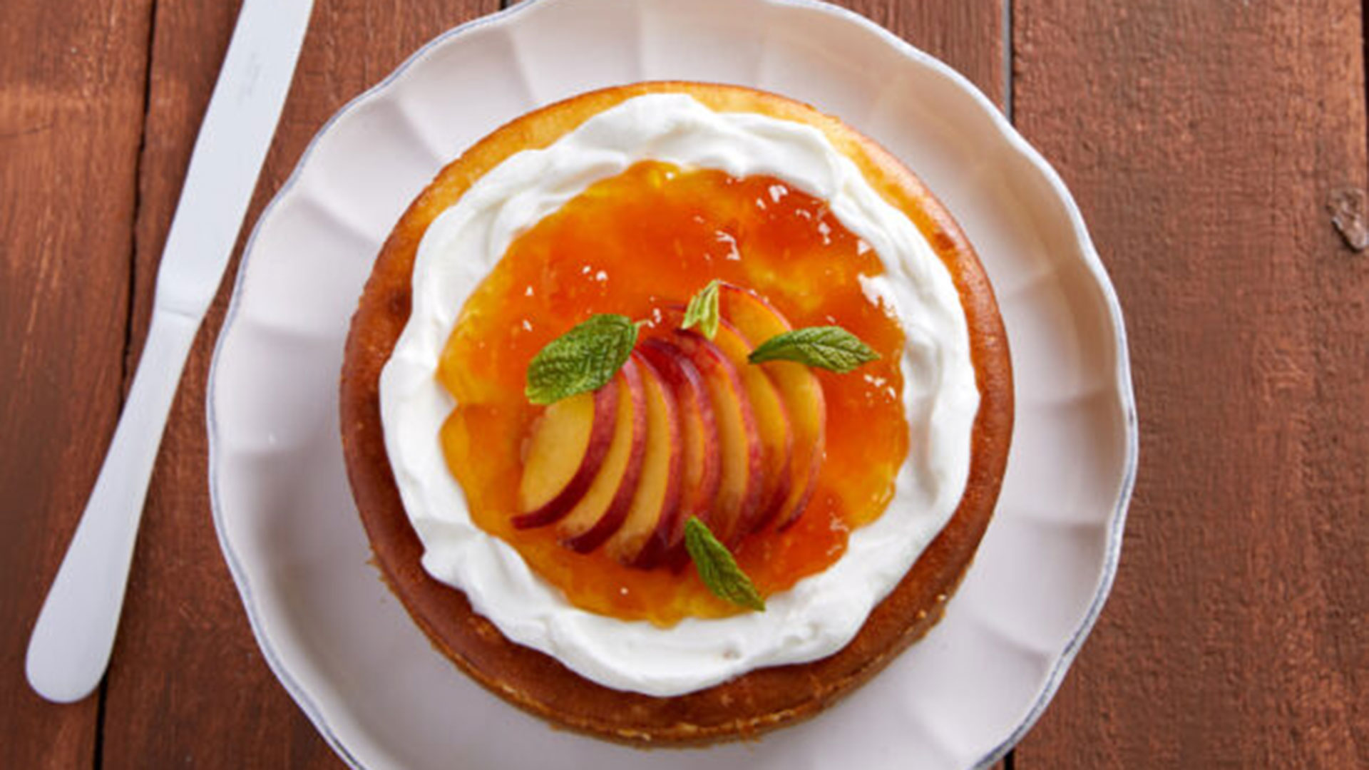 - Απλώνουμε σε λεπτή στρώση το γιαούρτι πάνω στην επιφάνεια του τσίζκεϊκ και έπειτα απλώνουμε τη μαρμελάδα ροδάκινο.