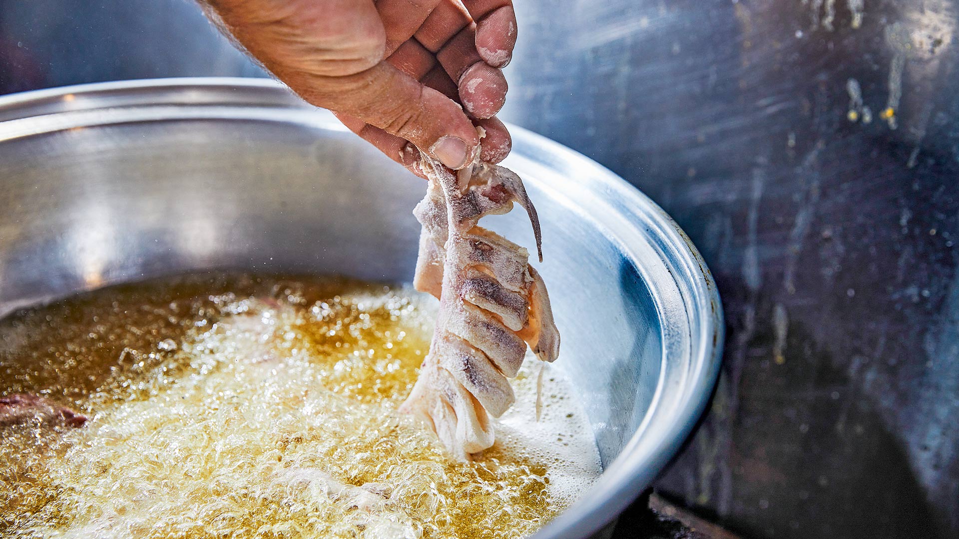 - Βάζουμε μπόλικο λάδι σε βαθύ τηγάνι και το ζεσταίνουμε σε δυνατή φωτιά.