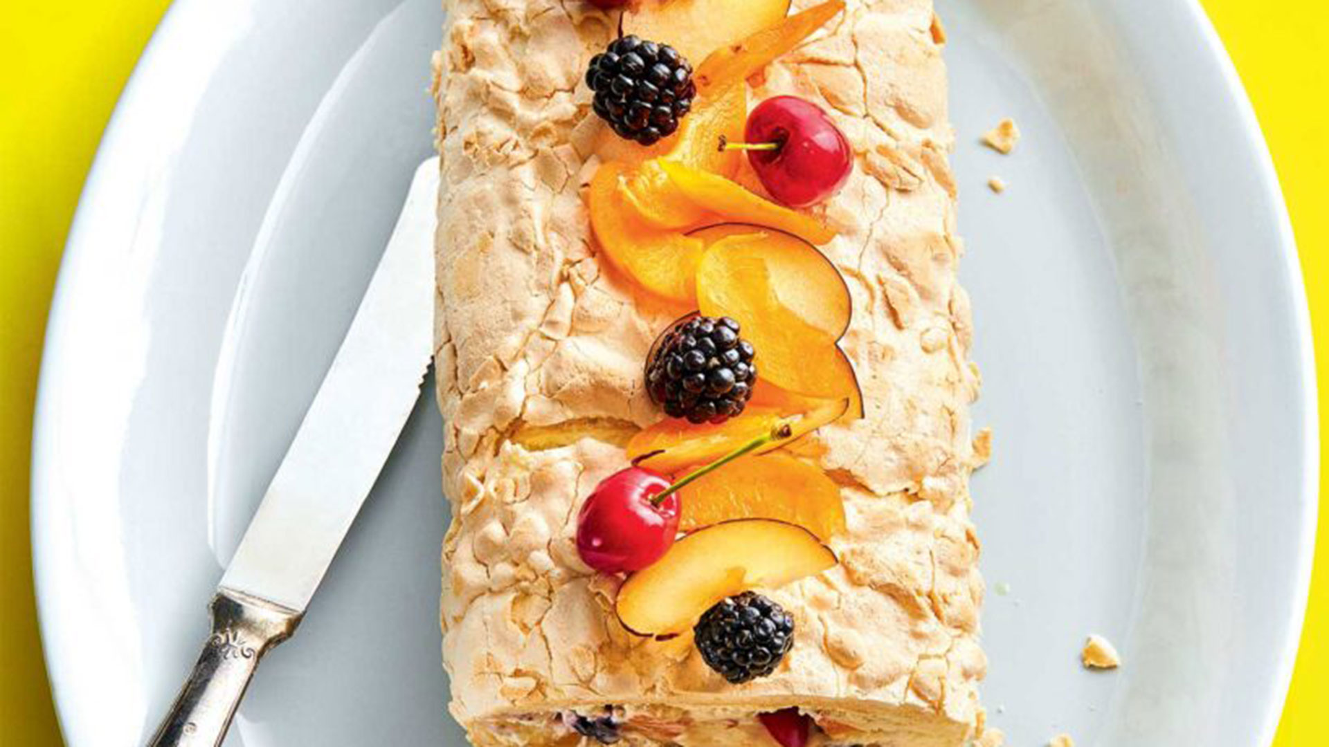 Με λίγα υλικά φτιάχνουμε ένα εντυπωσιακό ρολό μαρέγκας με γέμιση από σαντιγί και ανάμεικτα φρούτα του καλοκαιριού.