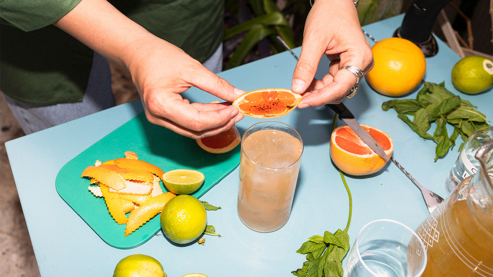 Όσο κάνουμε τις ετοιμασίες, δίπλα μια κυρία μαζεύει την μπουγάδα της. Ηλιακοί θερμοσίφωνες αντανακλούν το φως. Η πλαστική πράσινη περίφραξη έχει γείρει και καλώδια πετάγονται εδώ κι εκεί. Ταυτόχρονα μυρίζει αγιόκλημα, στον τενεκέ της φέτας ο βασιλικός έχει θεριέψει και αναδίδει το γλυκό άρωμά του κάθε φορά που τον ακουμπάς. Η μαλαγουζιά στη γλάστρα απλώνει τα φύλλα της. Στη φραουλιά οι καρποί έχουν ξεραθεί, δεν είναι πια η εποχή τους. Μονστέρες και φίκοι μπλέκονται με θυμάρια και πικροδάφνες. Τα φυτά τα κάνουν όλα πιο υποφερτά το καλοκαίρι στην Αθήνα. Η Μυρσίνη Σπανέλη bar manager στον Ελέφαντα στην Κάντζα κόβει από τη γλάστρα αρμπαρόριζα, που φυτρώνει παντού και έχει φανταστικό άρωμα λουκουμιού. Τη βάζει στο κοκτέιλ για να προσθέσει βάθος. Ο Μάρκος Πρίφτης, ιδιοκτήτης του Ham on Rye στα Εξάρχεια, βάζει κεράσι στο καταπράσινο, γλυκόξινο Japanese slipper -του αρέσουν τα κλασικά κοκτέιλ. Τα φρούτα του καλοκαιριού δίνουν χρώμα, όπως το καρπούζι που κόβει ο Γιάννης Μουλάς (bartender του CV στα Ιλίσια) για το καλοκαιρινό νεγκρόνι που ετοιμάζει. Η Πόπη Σεβαστού βάζει κύμινο στην παλόμα της. Αναπάντεχος συνδυασμός που την κάνει ντελικάτα ξεδιψαστική. Έτσι είναι τα κοκτέιλ της στα εστιατόρια Proveleggios και Nolan, όπου έχει αναλάβει το μπαρ. Η Νόρα Κουφού, που βρίσκεται φέτος μεταξύ νησιών και Πετραλώνων head bartender του Line, πάντα μας ξαφνιάζει με τις βιώσιμες ιδέες της. Κόβει φύλλα δυόσμου από τις γλάστρες μας για να αρωματίσει το δροσιστικό κοκτέιλ της και ό,τι περισσεύει το κρατάει για επόμενη χρήση.