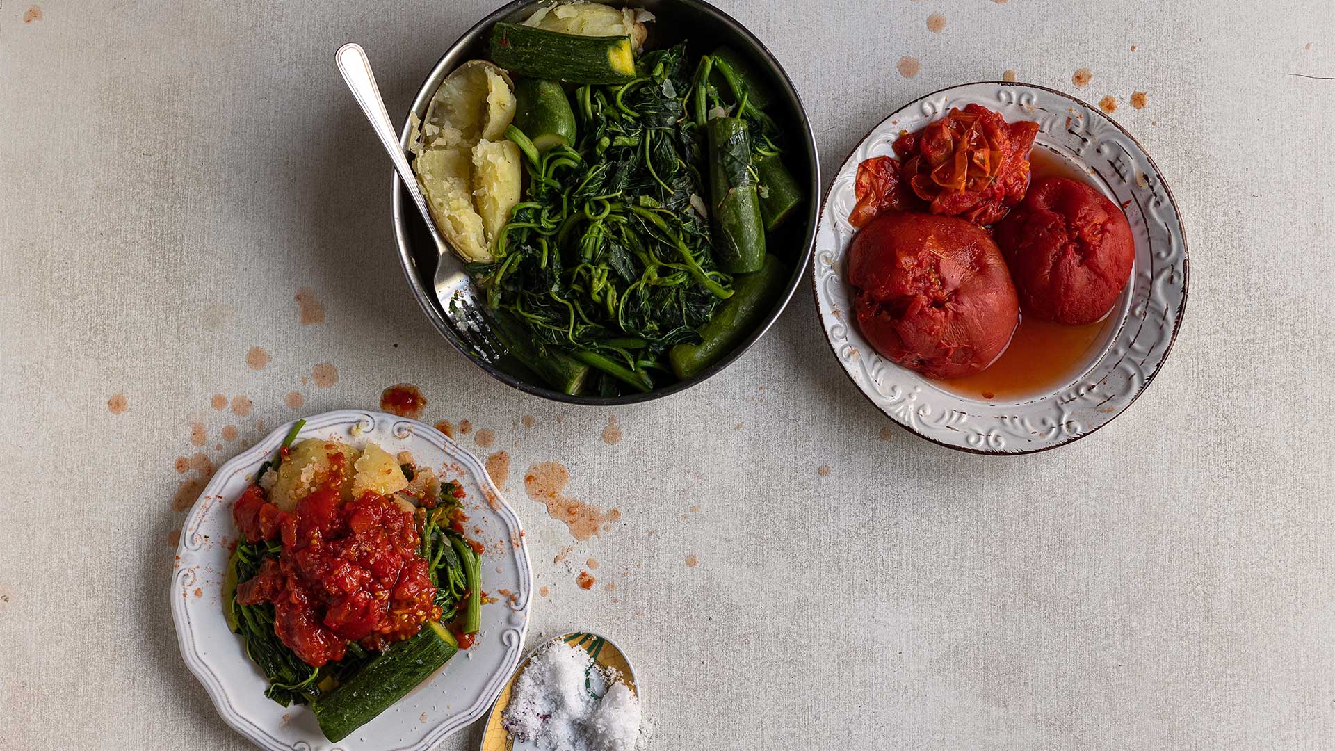 Μου είχαν πει ότι στο πρώην καφενείο, νυν ταβερνάκι, του Μανόλη Παπαδογιαννάκη στο Ατσιπόπουλο φτιάχνουν βλίτα με ντομάτες σύβραση και ήμουν περίεργη να τα δοκιμάσω. Όταν συναντήσαμε τον Μανόλη στο μικρό γωνιακό μαγαζί του, εκείνος είχε ήδη βάλει στην κατσαρόλα να βράζουν μαζί πατάτες, ντομάτες και κολοκυθάκια και μας υποδέχτηκε με ρακή. Ο Μανόλης σπούδασε στη Σχολή Εμποροπλοιάρχων, ταξίδεψε σε όλο τον κόσμο, ξεμπάρκαρε όταν παντρεύτηκε, δούλεψε για χρόνια ως ρεσεψιονίστας σε ξενοδοχεία και τελικά το 1997 άνοιξε το καφενεδάκι του στο χωριό της γυναίκας του Ελένης, το Ατσιπόπουλο, σε ένα παλιό, ερειπωμένο κτίριο που στέγαζε το πρώην κοινοτικό γραφείο. Πριν από λίγα χρόνια, το μικρό καφενείο, που είχε ήδη καθιερωθεί, μετατράπηκε σε ταβερνάκι, διατηρώντας όμως την παλιά φιλοσοφία: λίγοι μεζέδες φτιαγμένοι με την έμπνευση και τα βρισκούμενα της εποχής και της ημέρας. Έτσι κι αλλιώς, έχουν ανοίξει τόσες καφετέριες στο θορυβώδες Ατσιπόπουλο, που δεν θα μπορούσε να τις ανταγωνιστεί.