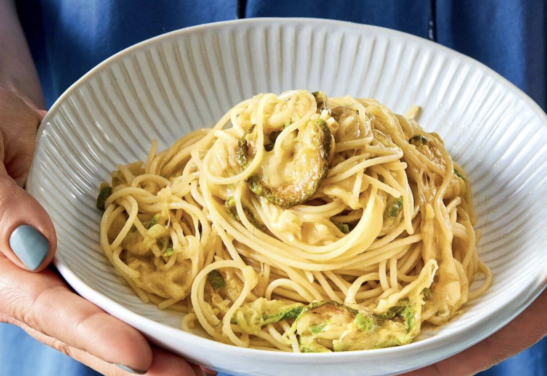 Συνταγή από το «μεγαλείο που λέγεται Καμπανία», λέει χαρακτηριστικά ο Χριστόφορος Πέσκιας για να περιγράψει αυτό το απίθανης νοστιμιάς πιάτο που μας ετοίμασε. Η ιστορία της συνταγής έχει ενδιαφέρον: Λέγεται πως την εμπνεύστηκε τη δεκαετία του 1950 η Maria Grazia, μια εστιάτορας στο χωριό Nεράνο στη χερσόνησο του Σορέντο, στην Καμπανία. Είναι μεν μια απλή, καθημερινή συνταγή, αλλά εξαιρετικά νόστιμη, που απέκτησε ξαφνικά παγκόσμια φήμη, όταν την παρουσίασε με ενθουσιασμό ο αγαπημένος Stanley Tucci στη γαστρονομική τηλεοπτική σειρά Searching for Italy, τιμώντας τη χώρα καταγωγής του. Πρόκειται λοιπόν για μια σπαγκετάδα με τραγανά τηγανητά κολοκυθάκια, ολόκληρα και σε πουρέ, τυρί Provolone και βασιλικό. Υλικά λίγα και απλά σε μια αυθεντική συνταγή της ιταλιάνικης cucina povera.