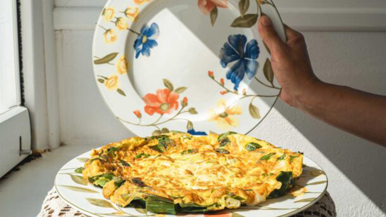 - Καπακώνουμε το σκεύος με μια μεγάλη πιατέλα ή με καπάκι και με σταθερή αλλά γρήγορη κίνηση τουμπάρουμε την ομελέτα ώστε η ψημένη πλευρά να έρθει προς τα πάνω.
