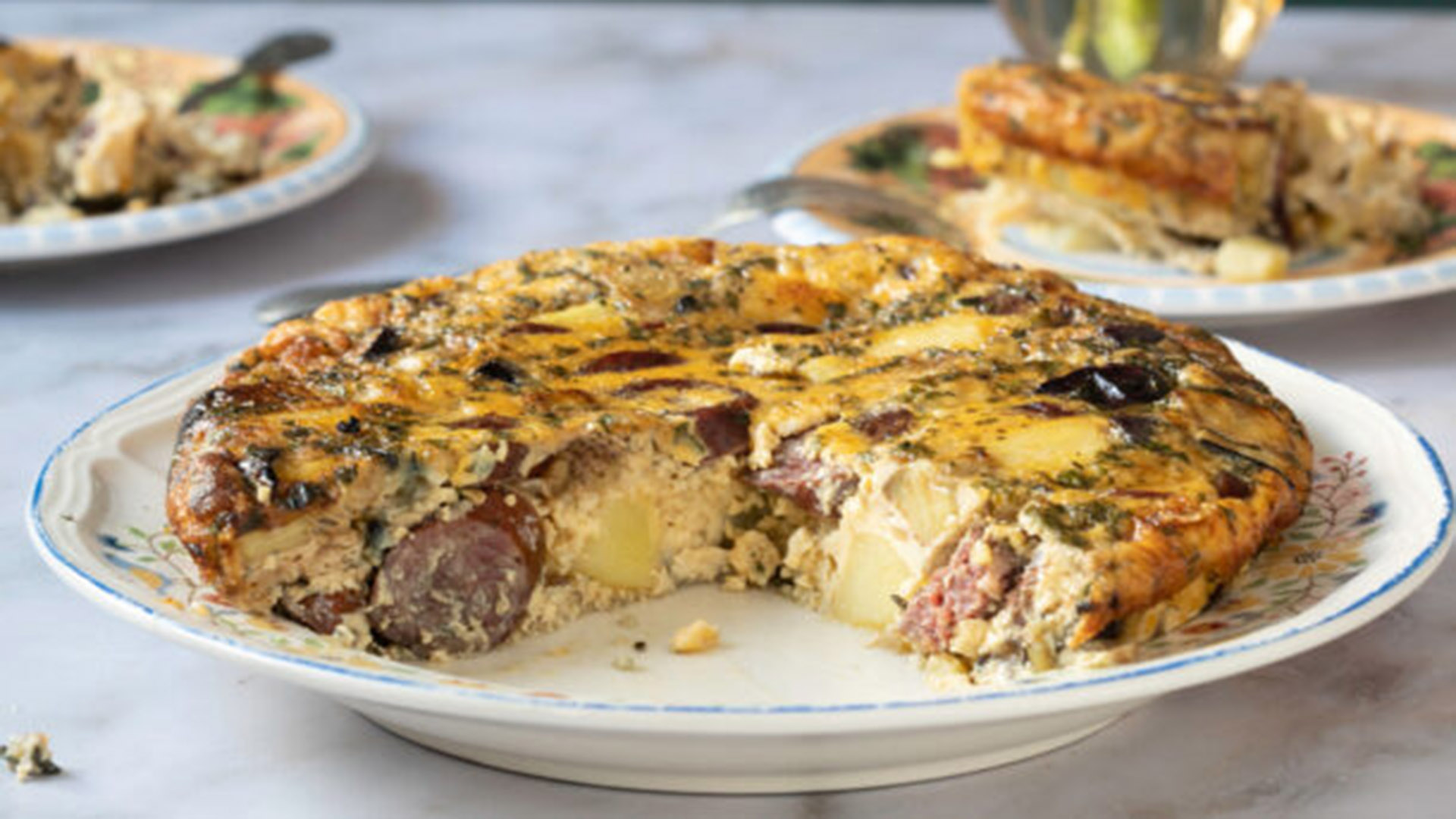 - Παράλληλα σε ένα μεγάλο μπολ χτυπάμε καλά τα αυγά και τα αλατοπιπερώνουμε. Προσθέτουμε τις πατάτες, τις μελιτζάνες, το μείγμα λουκάνικου-κρεμμυδιού, το γάλα και τον δυόσμο. Ανακατεύουμε απαλά.
