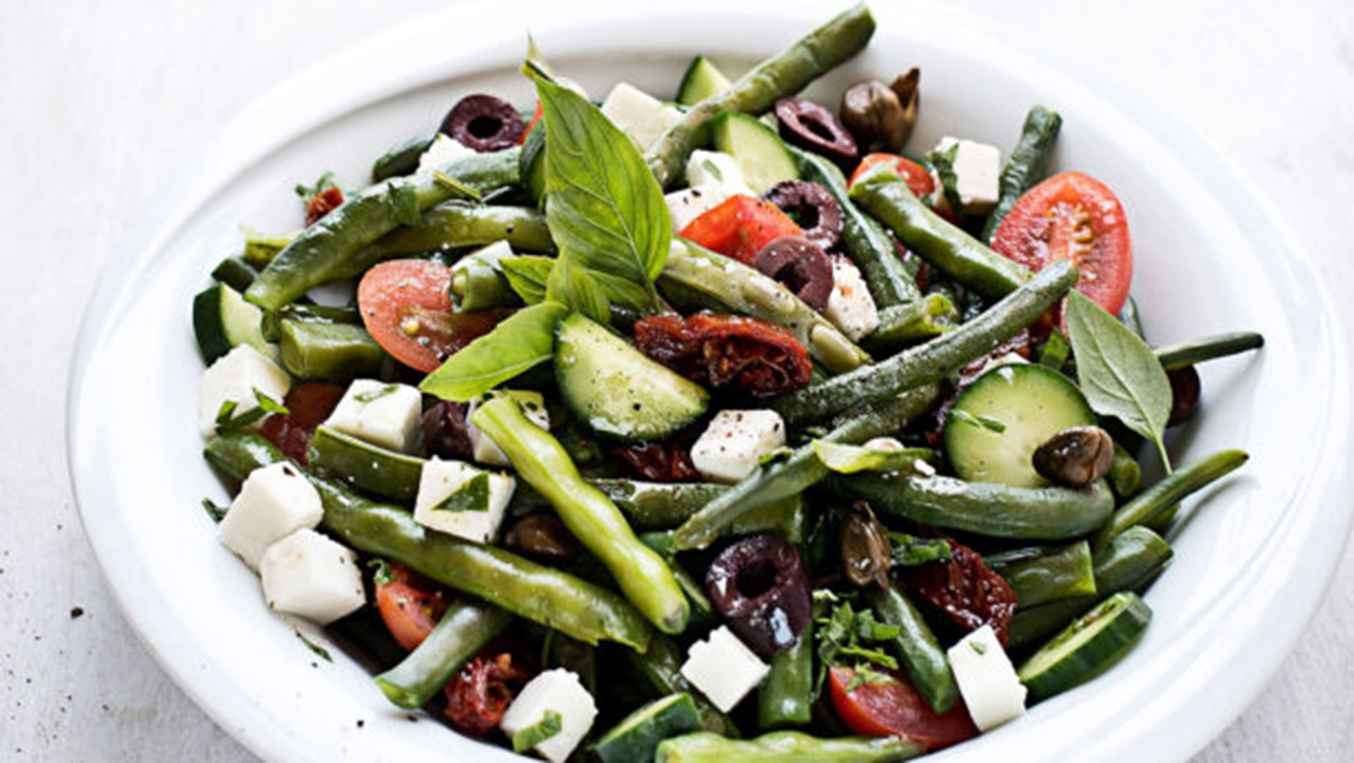 - Για να ετοιμάσουμε την χωριάτικη σαλάτα με φασολάκια, φέτα και λιαστές ντομάτες σε μια βαθιά κατσαρόλα με άφθονο αλατισμένο νερό που κοχλάζει βράζουμε τα φασολάκια για 8-10 λεπτά, μέχρι να μαλακώσουν ελαφρώς.