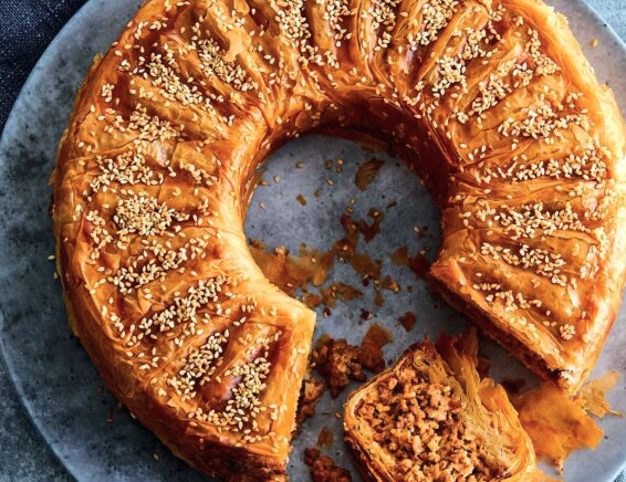- Σκεπάζουμε με τα υπόλοιπα φύλλα κρούστας, τα οποία επίσης λαδώνουμε ένα ένα και τα κόβουμε, χαράζοντάς τα με ένα μαχαιράκι στο σημείο όπου βρίσκεται η τρύπα της φόρμας.