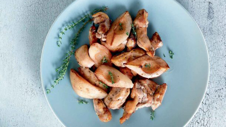 - Μαγειρεύουμε για περίπου 8 λεπτά, μέχρι να γίνει το κοτόπουλο και να μαλακώσουν τα αχλάδια, ανακατεύοντας τακτικά με ξύλινη κουτάλα. Αδειάζουμε σε πιατέλα.