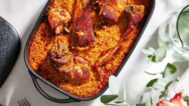 - Φουρνίζουμε και ψήνουμε για 1-1 1⁄2 ώρα, μέχρι να μαλακώσει το κρέας. Βγάζουμε το σκεύος από τον φούρνο, το ξεσκεπάζουμε και σκορπίζουμε το κουσκούς ανάμεσα στα κομμάτια του κρέατος. Θα πρέπει να έχει μείνει τόση σάλτσα ώστε να καλύψει το ζυμαρικό, διαφορετικά προσθέτουμε νερό, καυτό.
