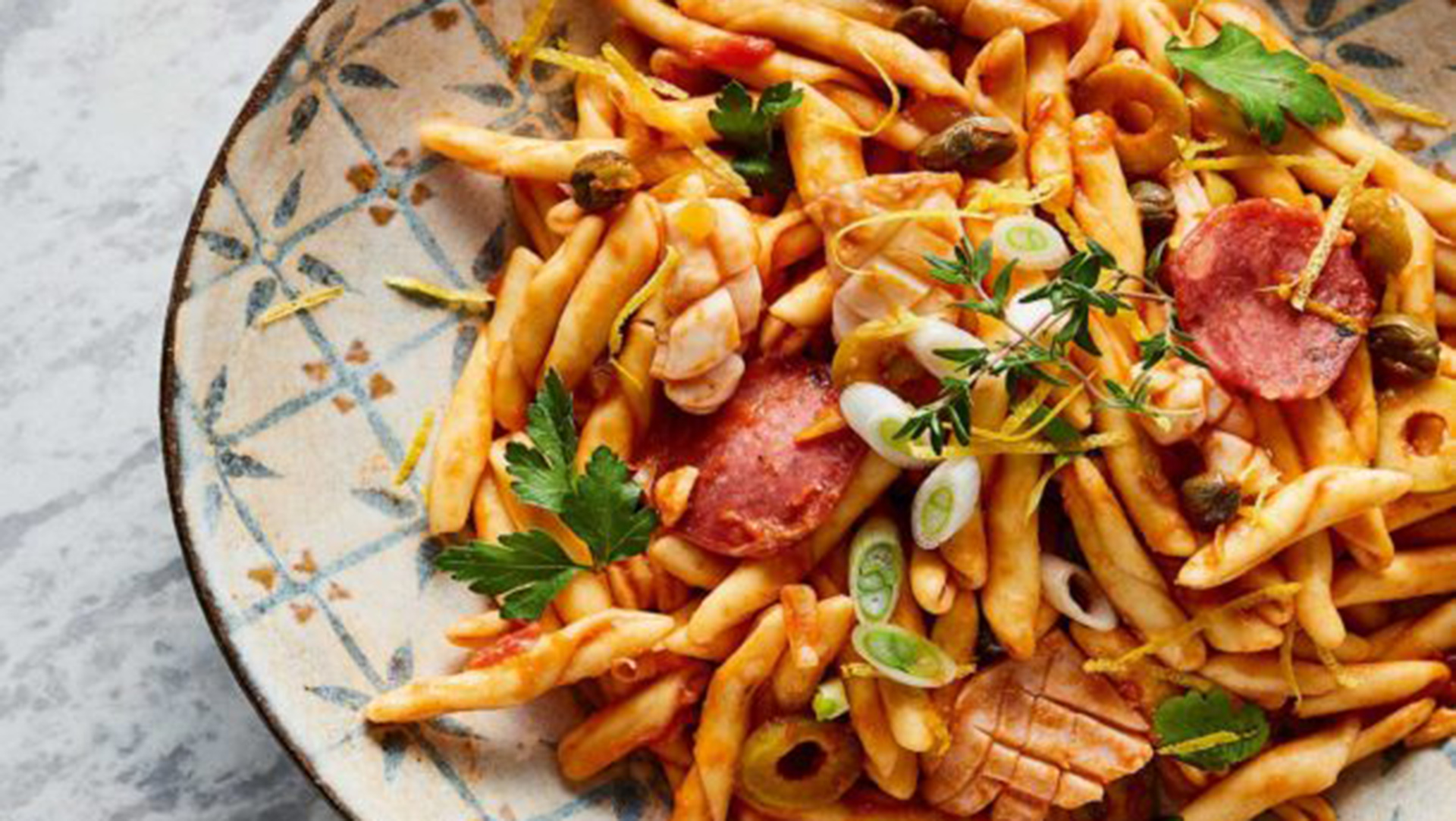 Σιουφιχτά με ολίγον καλαμάρι λεμονάτο, σαλάμι Λευκάδος, ελιές και κάππαρη. Τα σ(κ)ιουφικτά ή σκυφομακαρούνες είναι κρητικό ζυμαρικό και απαιτούν μεγάλη δεξιοτεχνία. Για να τα φτιάξουν χρησιμοποιούν βούρλο ή κάποια βέργα/καλαμάκι, γύρω από την οποία σχηματίζουν το ζυμαρικό, γι’ αυτό κι έχουν ωραίο σχήμα.