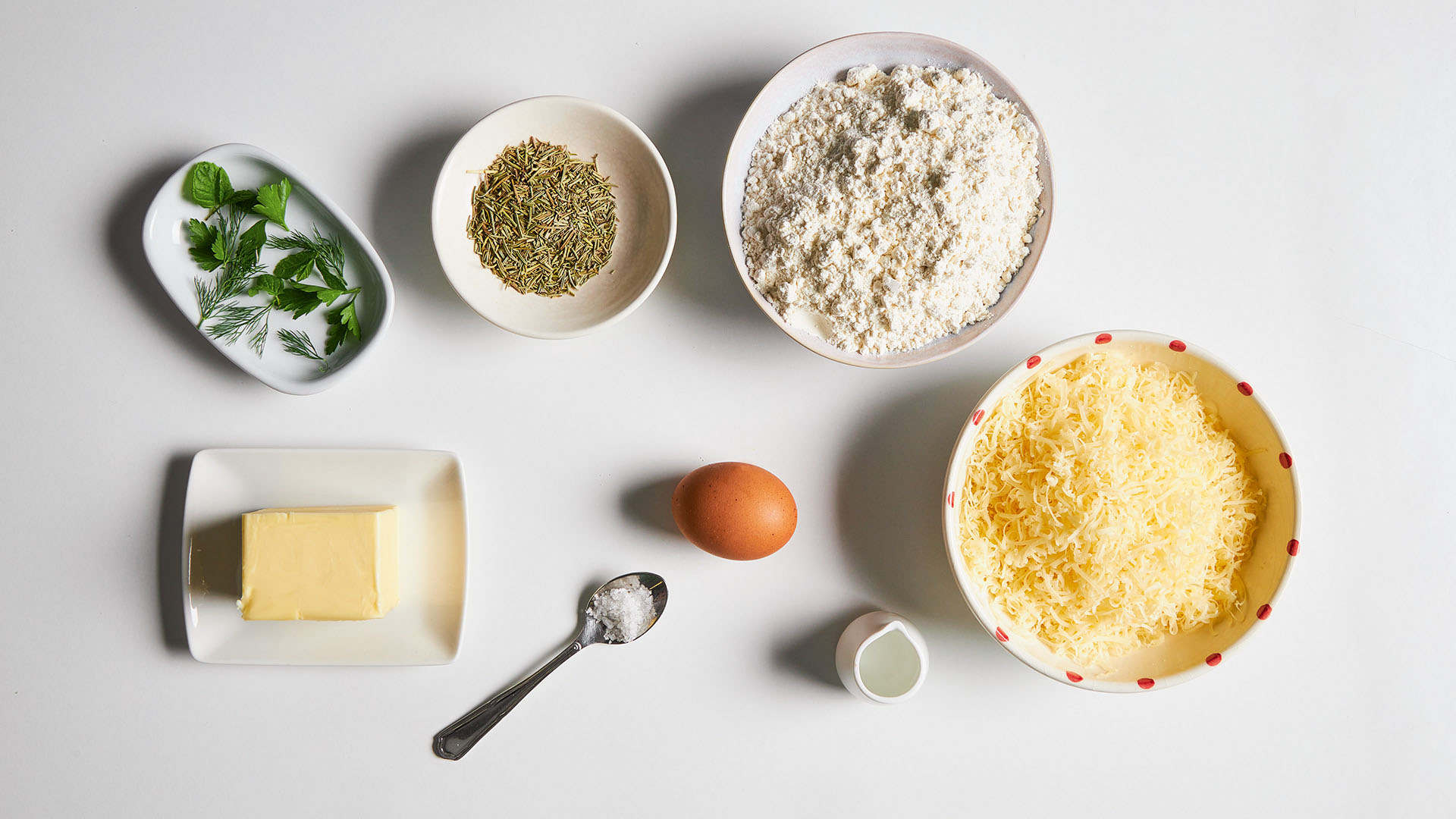Για να φτιάξουμε αλμυρά μπισκότα παρμεζάνας με μυρωδικά αρχικά ρίχνουμε, στον κάδο του μίξερ, το αλεύρι, το βούτυρο, την παρμεζάνα ή γραβιέρα, το θυμάρι ή δεντρολίβανο, το αυγό, αλάτι και πιπέρι.