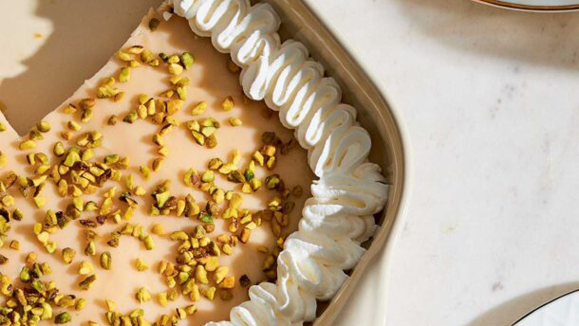 - Σκορπίζουμε τα φυστίκια Αιγίνης ή τα αμύγδαλα και σερβίρουμε το εκμέκ κομμένο σε κομμάτια.