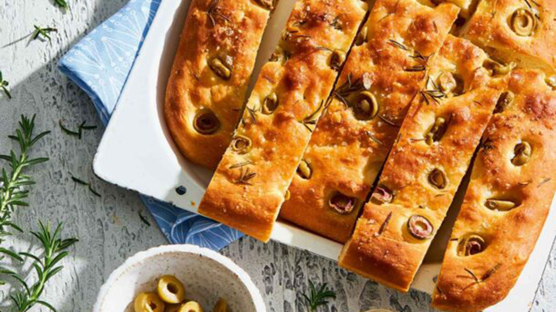 Φοκάτσια θυμίζει αυτό το εύκολο και πεντανόστιμο επίπεδο ψωμί που εμπλουτίζουμε με ελιές και μυρωδάτο δεντρολίβανο.