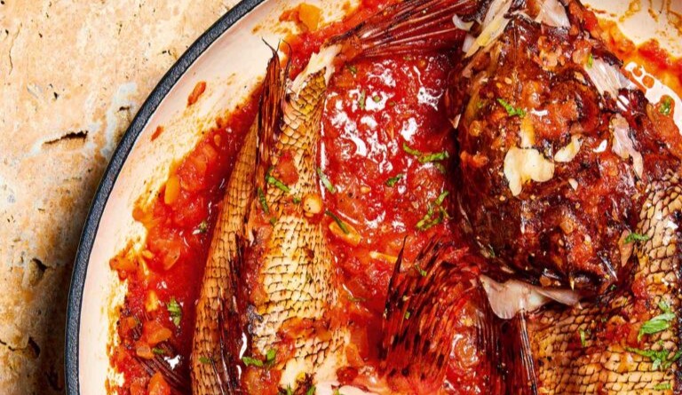 - Αδειάζουμε τη σάλτσα σε ένα ταψί που να χωρά τα ψάρια το ένα δίπλα στο άλλο.