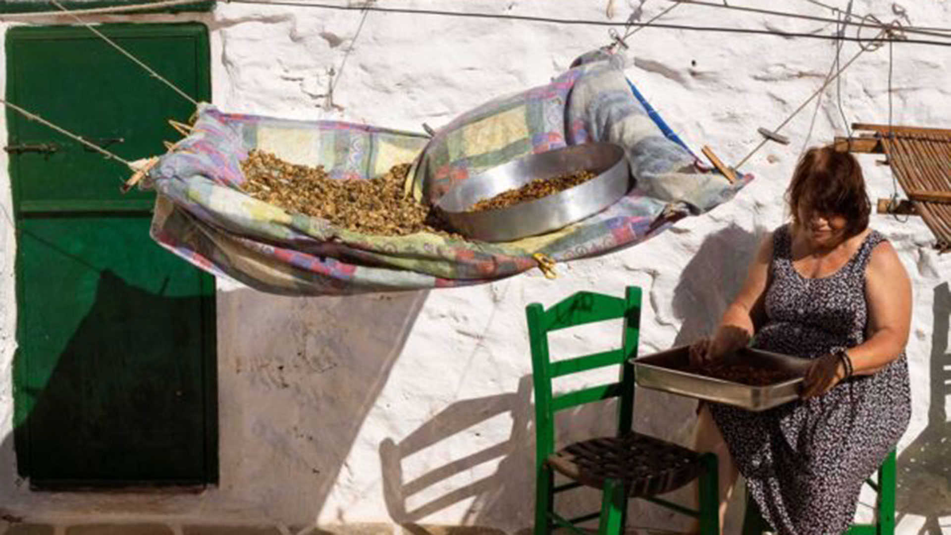 Πριν από τον τουρισμό, οι οικογένειες ζούσαμε με αυτά που παράγαμε στο νησί. Εμείς είχαμε κατσίκια και πρόβατα, κάναμε τα παραδοσιακά τυριά της Φολεγάνδρου, μανούρα, μυζήθρα και σουρωτό (ξινομυζήθρα δηλαδή), κι είχαμε και το τυρί το σκληρό, που το διατηρούσαν είτε σε κιούπια με λάδι είτε μέσα στη γύλη [σ.σ. οινολάσπη] του κρασιού. Και ελιές μαζεύαμε και είχαμε λάδι, κηπευτικά το καλοκαίρι. Κάναμε τη χοντρή κάππαρη λιαστή, την ξεραίναμε στον ήλιο και δύο μέρες μετά, όταν είχε ζέστη πολλή, ήταν έτοιμη. Δεν ξέρω να την κάνω αλλιώς παρά μόνο στιφάδο, όπως την έκανε και η μάνα μου. Ακόμα, ξεραίναμε στον ήλιο σταφίδες, στο τέλος του καλοκαιριού μαζεύαμε πάντα από το βουνό φασκόμηλα, δυόσμους, δεντρολίβανα, για να τα έχουμε και τον χειμώνα, μαζεύαμε σουσάμι και φασόλια. Στο μαγαζί κάνουμε ακόμα τα παραδοσιακά ρεβύθια, που τα πάμε στον φούρναρη για να μας τα ψήσει στον ξυλόφουρνο – τα δίνω σήμερα και θα τα πάρω αύριο. Εκείνα τα χρόνια ήταν δικής μας παραγωγής τα ρεβύθια, τώρα πια δεν καλλιεργούνται εδώ.