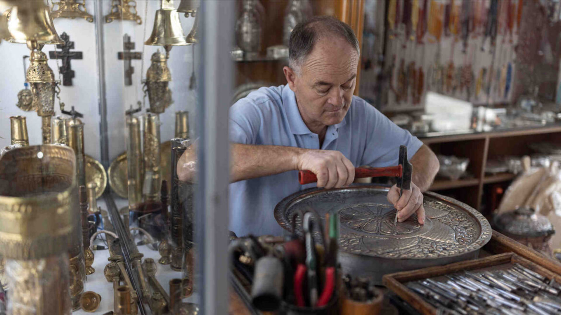 Μπαίνοντας στο κατάστημα του κ. Πανταζή, τον βλέπουμε καθισμένο μπροστά σε έναν μικρό πάγκο, μια μικρογραφία του εργαστηρίου του, όπου τα πρωινά συνήθως κάθεται για να τελειοποιήσει κάποιο σχέδιο. Μπροστά του είναι απλωμένα δεκάδες διαφορετικά καλέμια με ποικίλα πάχη και διαφορετικές μύτες. Οι Γιαννιώτες σκαλιστές χρησιμοποιούν την τεχνική του σφυροκάλεμου για να κεντήσουν τις παραστάσεις τους πάνω στο αντικείμενο, το οποίο κολλούν σε πίσσα για να απορροφά τους κραδασμούς του σφυριού. Για να είναι πιο ανάγλυφο το σχέδιο, πριν ξεκινήσουν, χτυπούν το σκεύος από την ανάποδη όψη με ειδικά εργαλεία για να φουσκώσει. Ενα ταψί μπορεί να τους πάρει από πέντε ώρες μέχρι πέντε μέρες. Ο χρόνος εξαρτάται από το πόση λεπτομέρεια θέλουν να βάλουν στο σχέδιο. Τον ρωτάω πόσο καιρό τού πήρε να μάθει. «Ακόμα μαθαίνω», μου απάντησε. Από 12 χρονών ξεκίνησε να δουλεύει μαθητευόμενος δίπλα σε έναν συγχωριανό του, μέχρι που το 1992, στα 26 του, άνοιξε το δικό του μαγαζί. «Λιγόστεψαν πάρα πολύ όσοι έκαναν αυτή τη δουλειά. Τα παιδιά τους δεν ήθελαν να αναλάβουν και δεν συνέχισαν. Ελάχιστοι μείναμε και είμαστε πια κάποιας ηλικίας τώρα που φτάνουμε στη σύνταξη. Το δικό μου μαγαζί δεν βλέπω να το συνεχίζει κάποιος. Τα παιδιά σπουδάσανε και τα δύο και πήραν άλλους δρόμους…»