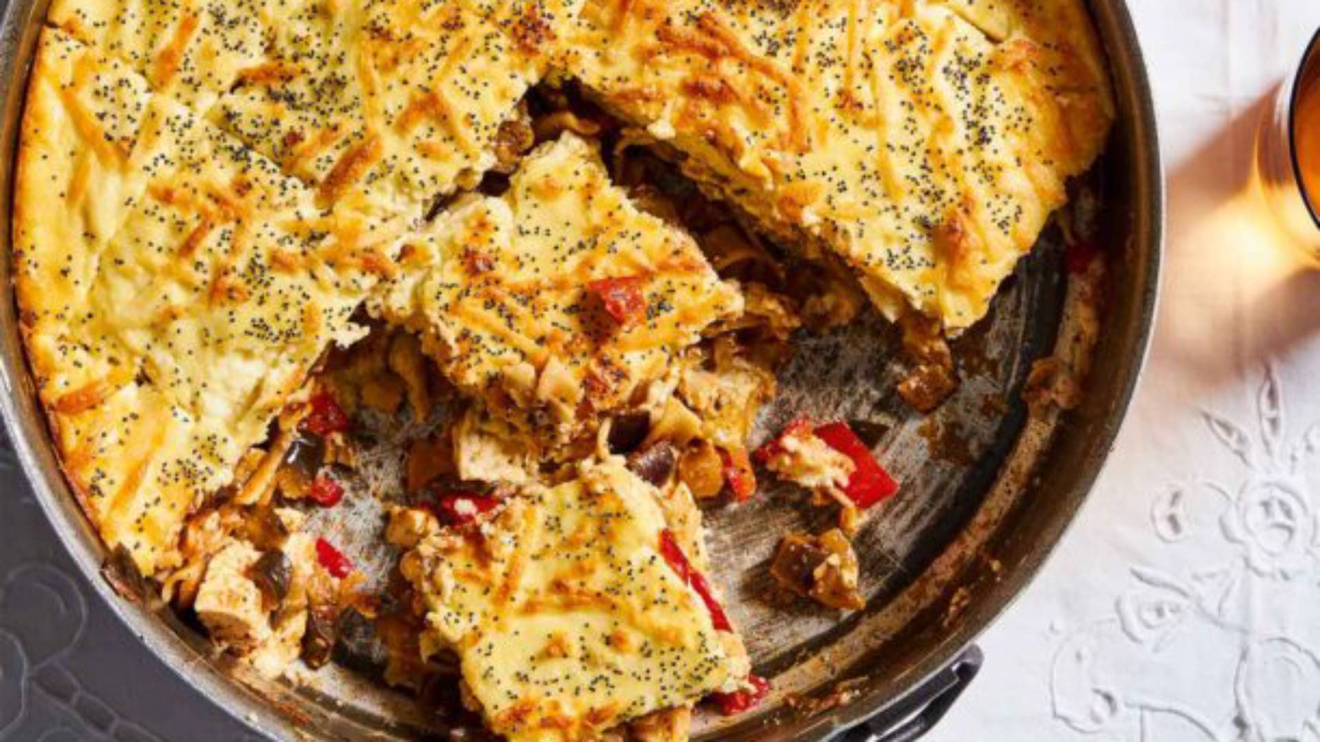 Το «καλό» φαγητό της Λήμνου είναι ο κόκορας με φλωμάρια, το τοπικό χυλοπιτάκι που ζυμώνεται με τα περίφημα ντόπια στάρια και γάλα κατσικίσιο ή πρόβειο. Στην πιο φτωχική, καθημερινή της εκδοχή, η συνταγή δεν περιέχει κόκορα, αλλά ψωμωμένες μελιτζάνες, δίνοντας εξίσου σπουδαία γεύση σε ένα απλό πιάτο. Η εκδοχή που μας έδωσε η Λημνιά σεφ Μάλαμα Μπανάβου είναι πιο σύνθετη και πληθωρική, αφού τα ζυμαρικά με τις μελιτζάνες και τη σάλτσα μπαίνουν ανάμεσα σε δύο στρώσεις μπεσαμέλ και ψήνονται στον φούρνο σαν παστίτσιο.