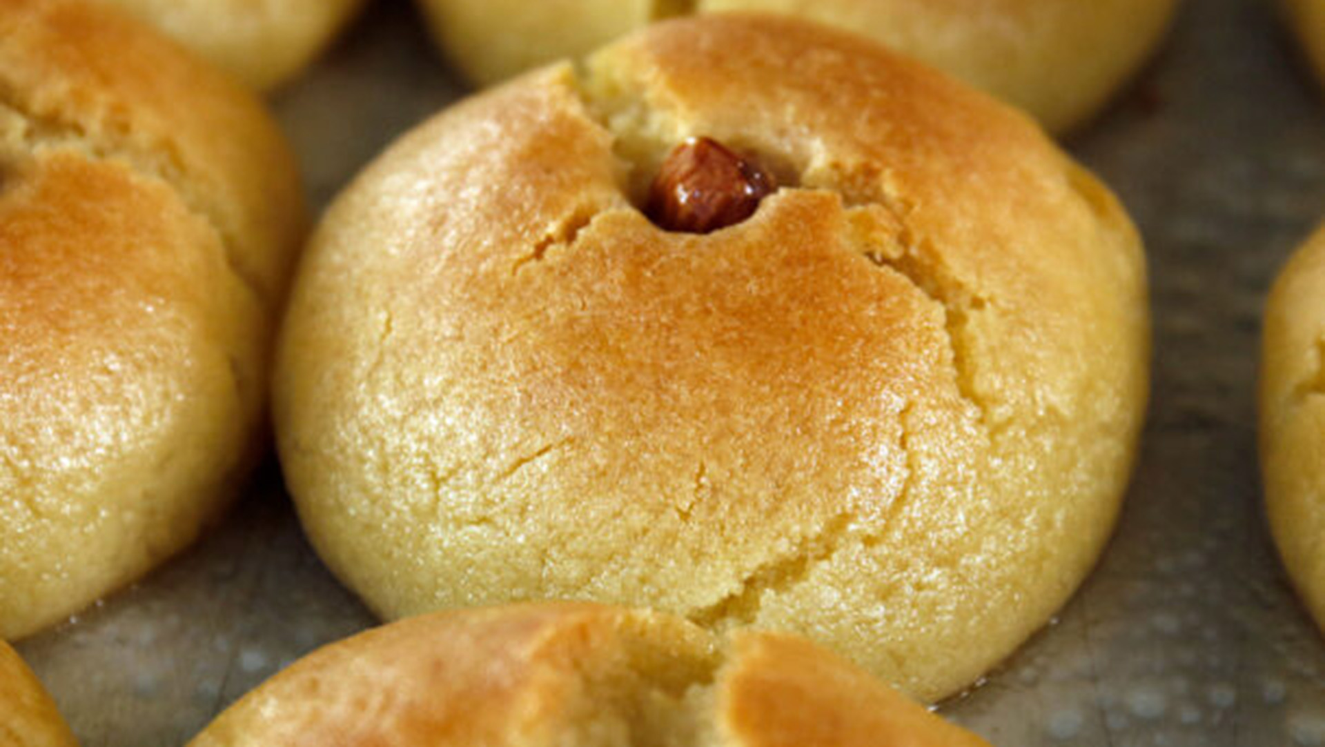- Βγάζουμε τη ζύμη από το ψυγείο και την πλάθουμε σε στρογγυλά μπαλάκια λίγο πιο μεγάλα από καρύδια, τα πιέζουμε ελαφρά με το δάχτυλο στη μέση και στο βαθούλωμα που σχηματίζεται τοποθετούμε από 1 αμύγδαλο.