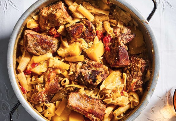 «Συνταγή της παλιάς κερκυραϊκής κουζίνας που πιθανόν να πέρασε στο νησί από τη γείτονα Ίταλία. Τη συναντάμε πάντως στην Απουλία, τη Σικελία, τη Σαρδηνία και τη Μάλτα, με μικρές παραλλαγές», εξηγεί ο Κερκυραίος σεφ του εστιατορίου Pomo d’Oro στην πόλη της Κέρκυρας, Αριστοτέλης Μέγκουλας, και συμπληρώνει: «Συνηθίζεται στο νησί να προσθέτουμε ζυμαρικά στο “σούγο”, δηλαδή την πυκνή, δεμένη σάλτσα των μαγειρευτών και ψητών. Άλλες φορές τα κρεατικά συνοδεύονται με πατάτα ή με κερκυραϊκούς “νιόκους”, δηλαδή νιόκι».