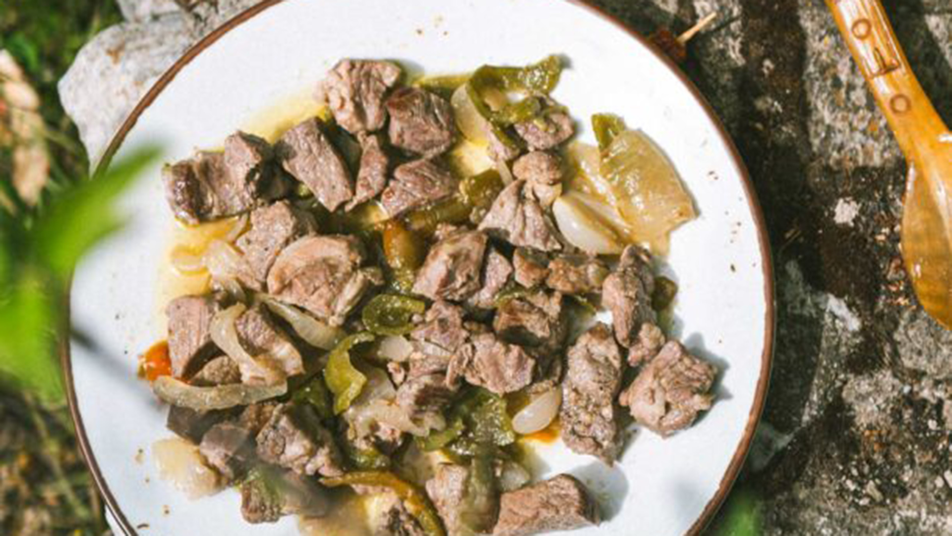 - Προσθέτουμε τα κρεμμύδια και όλες τις πιπεριές και σοτάρουμε για άλλα 3-4 λεπτά, μέχρι να μαλακώσουν τα λαχανικά, το κρέας να ροδίσει καλά και τα κομμάτια να ψηθούν και στο εσωτερικό τους.