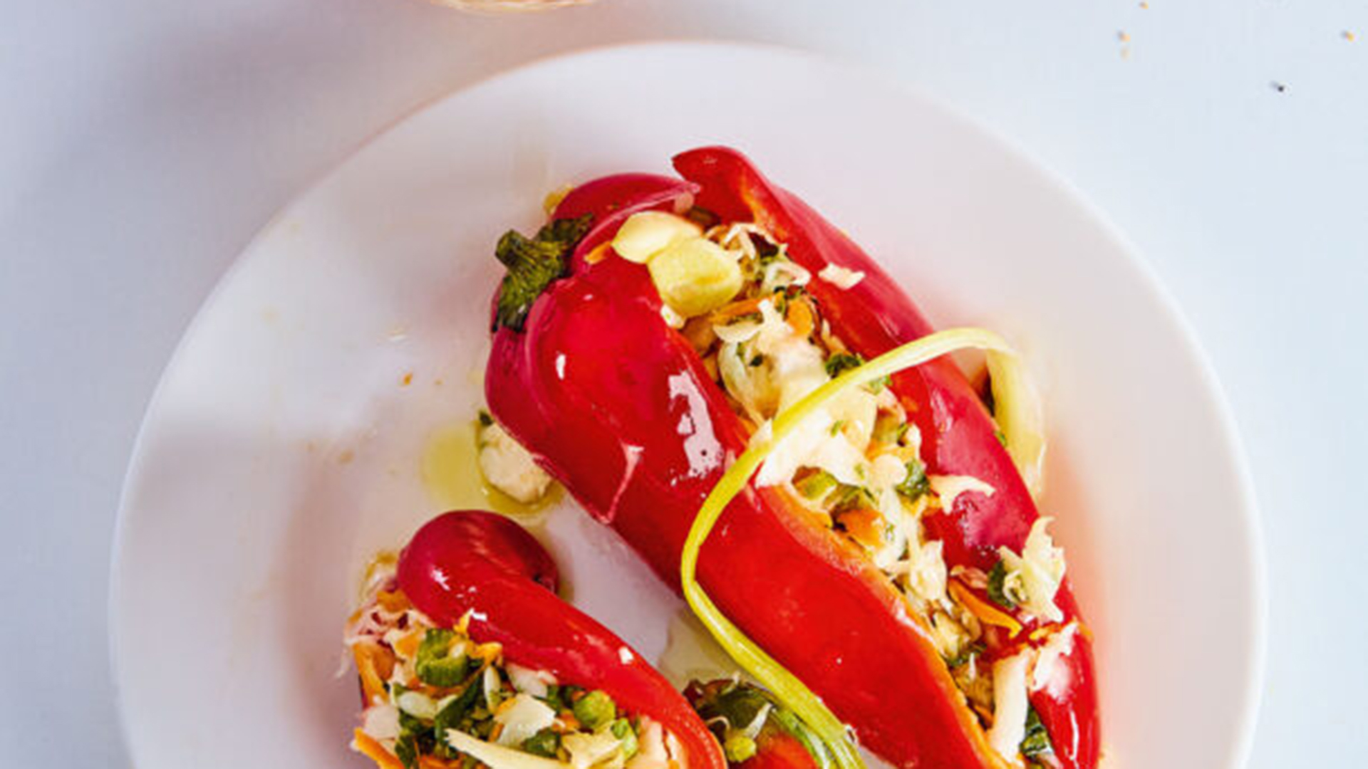 Σε μια λεκάνη ανακατεύουμε το λάχανο, τα καρότα, τα μυρωδικά και το σκόρδο. Γεμίζουμε τις πιπεριές και τις κλείνουμε με τα «καπάκια» τους που αφήσαμε στην άκρη.