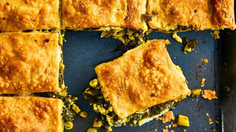- Τη στρώνουμε ομοιόμορφα και την καλύπτουμε με το δεύτερο φύλλο. Γυρίζουμε τις άκρες των φύλλων προς τα μέσα, διπλώνοντάς τες σε όμορφο κόθρο, χαράζουμε την πίτα σε κομμάτια και αλείφουμε την επιφάνειά της με το υπόλοιπο βούτυρο.
